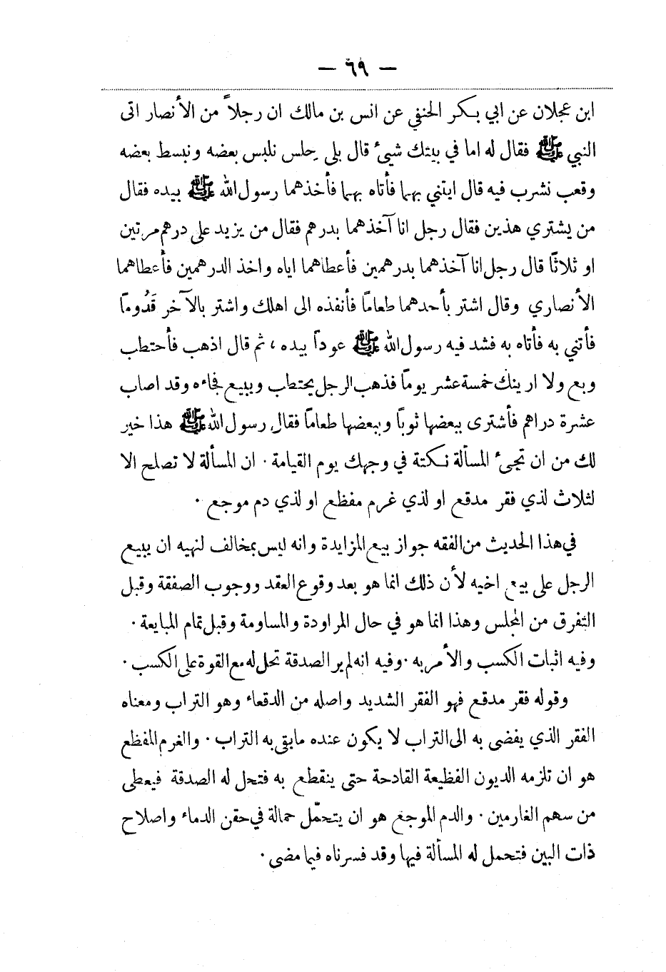 بن عجلان، عَن أبي بكر الحنفى عن أنس بن مالك أن رجلا من الأنصار أتى النبي صلى الله عليه وسلم فقال له أما في بيتك شيء قال بلى حِلس نلبس بعضه ونبسط بعضه وقعب نشرب فيه قال ائتني بهما فأتاه بهما فأخذهما رسول الله صلى الله عليه وسلم بيده فقال من يشتري هذين فقال رجل أنا آخذهما بدرهم فقال من يزيد على درهم مرتين أو ثلاثا قال رجل أنا آخذهما بدرهمين فأعطاهما إياه وأخذ الدرهمين فأعطاهما الأنصاري وقال اشتر بأحدهما طعاما فانفذه إلى أهلك واشتر بالاخر قدوما فأتنى به فأتاه به فشد فيه رسول الله صلى الله عليه وسلم عوداً بيده، ثم قال اذهب فاحتطب وبع ولا أرينك خمسة عشر يوما فذهب الرجل يحتطب ويبيع فجاءه وقد أصاب عشرة دراهم فاشترى ببعضها ثوبا وببعضها طعاما فقال رسول الله صلى الله عليه وسلم هذا خير لك من أن تجيء المسألة نكتة في وجهك يوم القيامة. إن المسألة لا تصلح إلاّ لثلاث لذي فقر مدقع أو لذي غرم مفظع أولذي دم موجع.