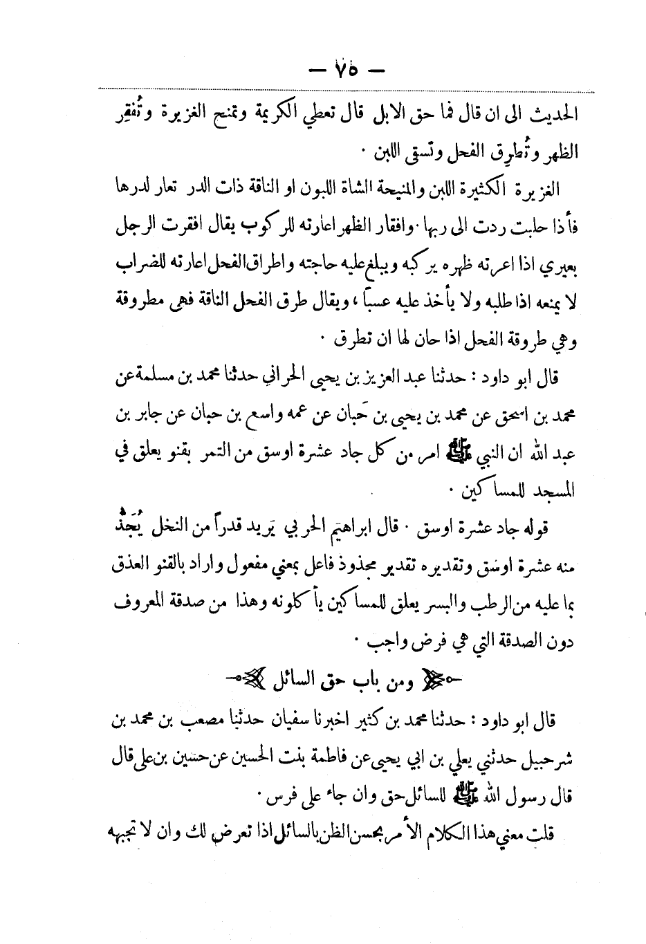 الحديث إلى أن قال فما حق الإبل قال تعطي الكريمة وتمنح الغزيرة وتُفقِر الظهر وتُطرِق الفحل وتسقي اللبن.