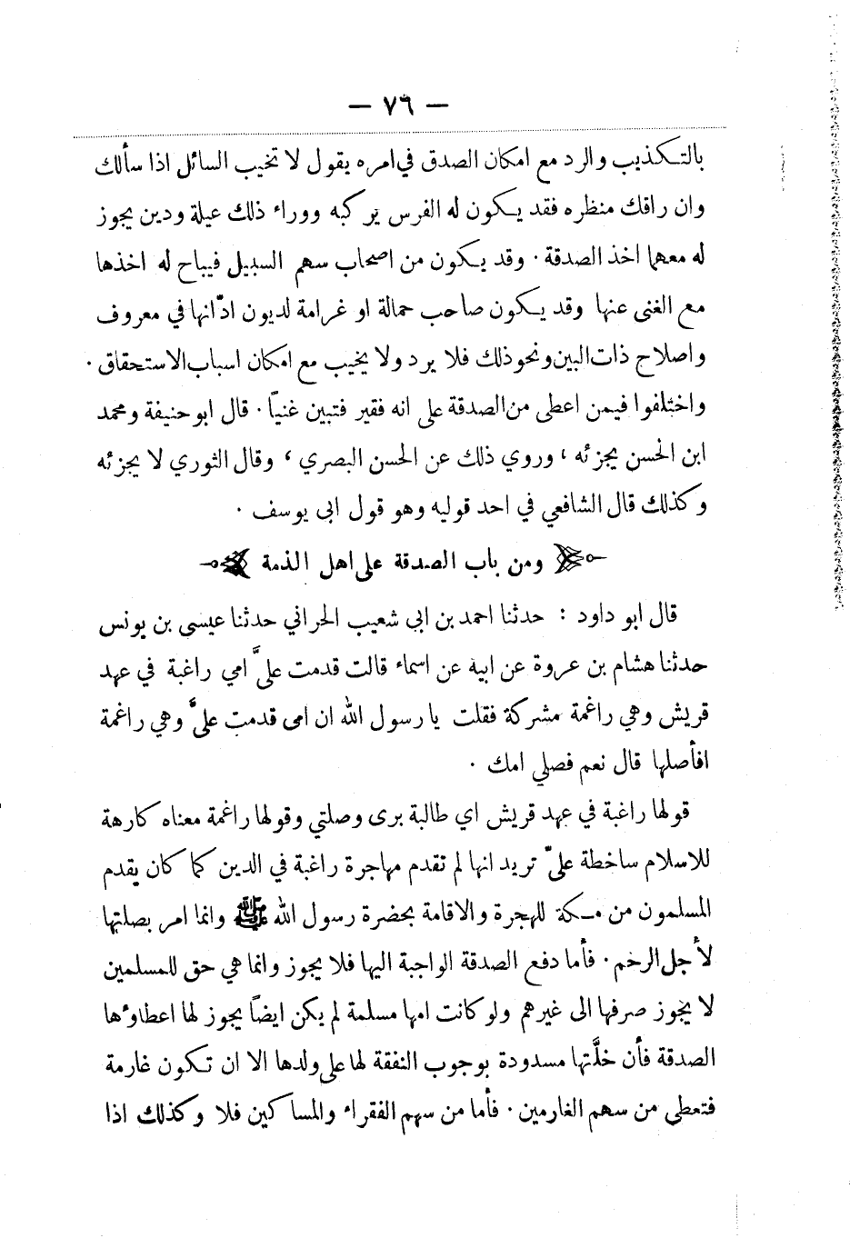قال أبو داود: حدثنا أحمد بن أبي شعيب الحراني حدثنا عيسى بن يونس حدثنا هشام بن عروة عن أبيه عن أسماء قالت قدمت عليَّ أمي راغبة في عهد قريش وهي راغمة مشركه فقلت يا رسول الله إن أمى قدمت علي وهي راغمة افأصلها قال نعم فصلي أمك.