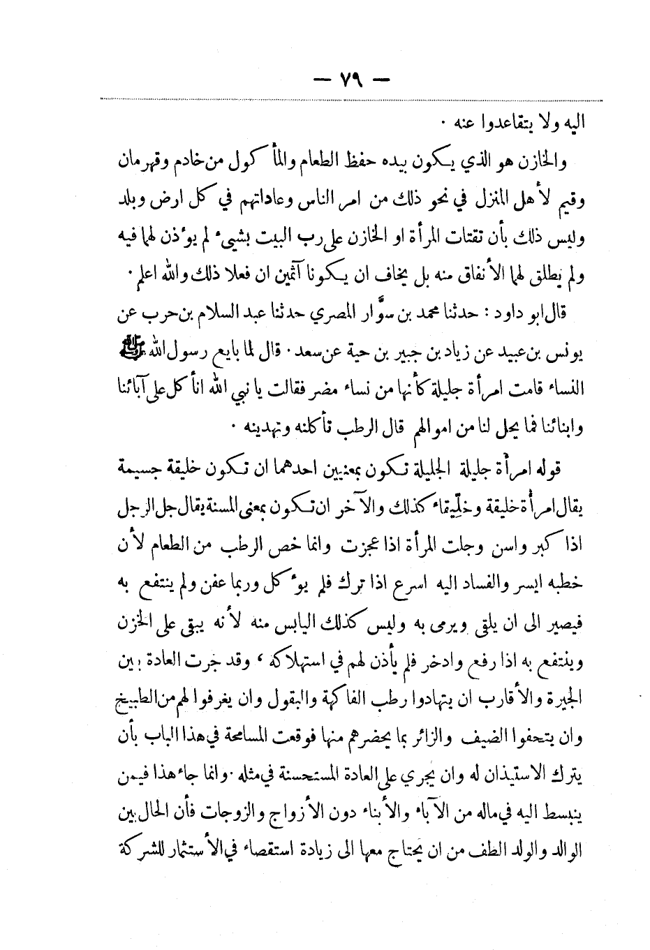 قال أبو داود: حدثنا محمد بن سوَّار المصري حدثنا عبد السلام بن حرب عن يونس بن عبيد عن زياد بن جبير بن حية عن سعد. قال لما بايع رسول الله صلى الله عليه وسلم النساء قامت امرأة جليلة كأنها من نساء مضر فقالت ما نبي الله أنأكل على آبائنا وأبنائنا فما يحل لنا من أموالهم قال الرطب تأكلنه وتهدينه.