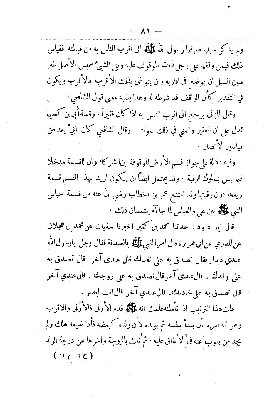 قال أبو داود: حدثنا محمد بن كثير أخبرنا سفيان عن محمد بن عجلان عن المقبري، عَن أبي هريرة قال أمرالنبي صلى الله عليه وسلم بالصدقة فقال رجل يا رسول الله عندي دينار فقال تصدق به على نفسك قال عندي آخر قال تصدق به على ولدك. قال عندي آخر قال تصدق به على زوجك. قال عندي آخر قال تصدق به على خادمك. قال عندي آخر قال أنت أبصر.