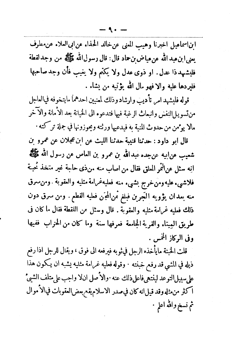 قال أبو داود: حدثنا قتيبة حدثنا الليث عن ابن عجلان عن عمرو بن شعيب عن أبيه عن جده عبد الله بن عمرو بن العاص عن رسول الله صلى الله عليه وسلم أنه سئل عن الثمر المعلق فقال من أصاب منه من ذي حاجة غير متخذ خُبنة فلا شيء عليه ومن خرج بشيء منه فعليه غرامة مثليه والعقوبة. ومن سرق منه بعد أن يؤويه الجَرين فبلغ ثمن المجَن فعليه القطع. ومن سرق دون ذلك فعليه غرامة مثليه والعقوبة. قال وسئل عن اللقطه فقال ما كان في طريق المِيتاء والقرية الجامعة فعرفها سنة وما كان من الخراب ففيها وفي الركاز الخمس.