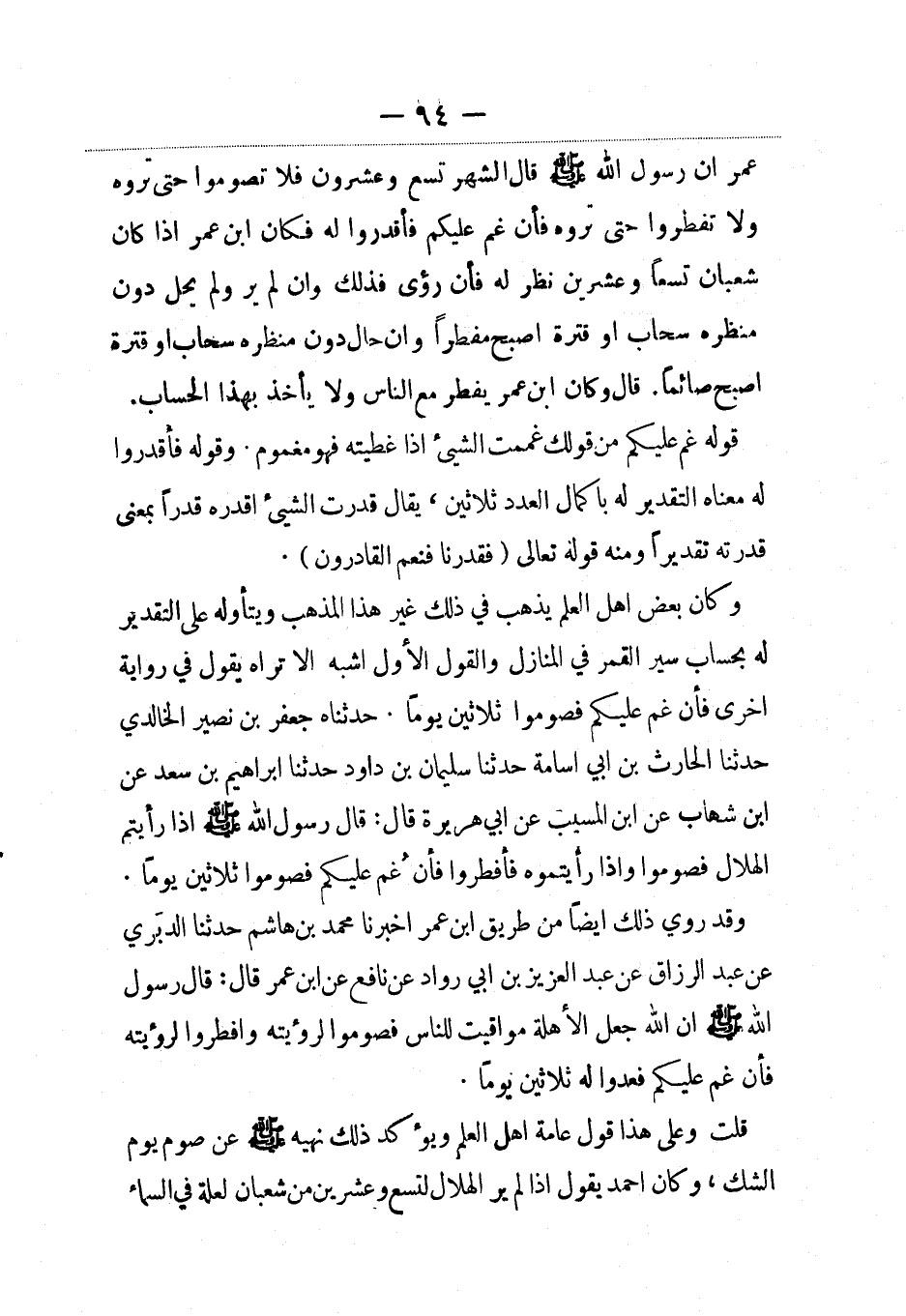 عمر أن رسول الله صلى الله عليه وسلم قال الشهر تسع وعشرون فلا تصوموا حتى تروه ولا تفطروا حتى تروه فإن غم عليكم فأقدروا له فكان ابن عمر إذا كان شعبان تسعا وعشرين نظر له فإن رئي فذلك. وإن لم ير ولم يحل دون منظره سحاب أو قترة أصبح مفطراً وإن حال دون منظره سحاب أو قترة أصبح صائماً. قال وكان ابن عمر يفطر مع الناس ولا يأخذ بهذا الحساب.