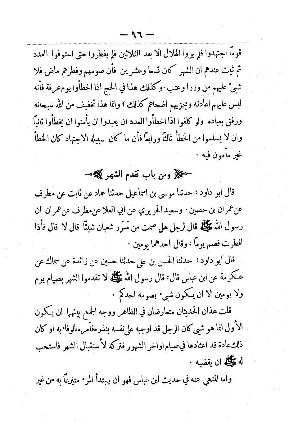 قال أبو داود: حدثنا الحسن بن علي حدثنا حسين عن زائدة عن سماك عن عكرمة عن ابن عباس قال: قال رسول الله صلى الله عليه وسلم لا تقدموا الشهر بصيام يوم ولا يومين إلاّ أن يكون شيء يصومه أحدكم.