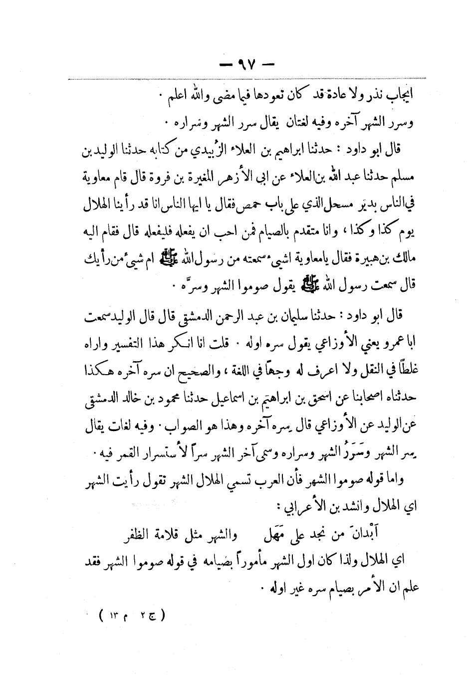 قال أبو داود: حدثنا إبراهيم بن العلاء الزُبيدي من كتابه حدثنا الوليد بن مسلم حدثنا عبد الله بن العلاء، عَن أبي الأزهر المغيرة بن فروة قال قام معاوية في الناس بدير مسحل الذي على باب حمص فقال يا أيها الناس إنا قد رأينا الهلال يوم كذا وكذا، وأنا متقدم بالصيام فمن أحب أن يفعله فليفعله قال فقام إليه مالك بن هبيرة فقال يا معاوية أشيء سمعته من رسول الله صلى الله عليه وسلم أم شيء من رأيك قال سمعت رسول الله صلى الله عليه وسلم يقول صوموا الشهر وسرَّه.