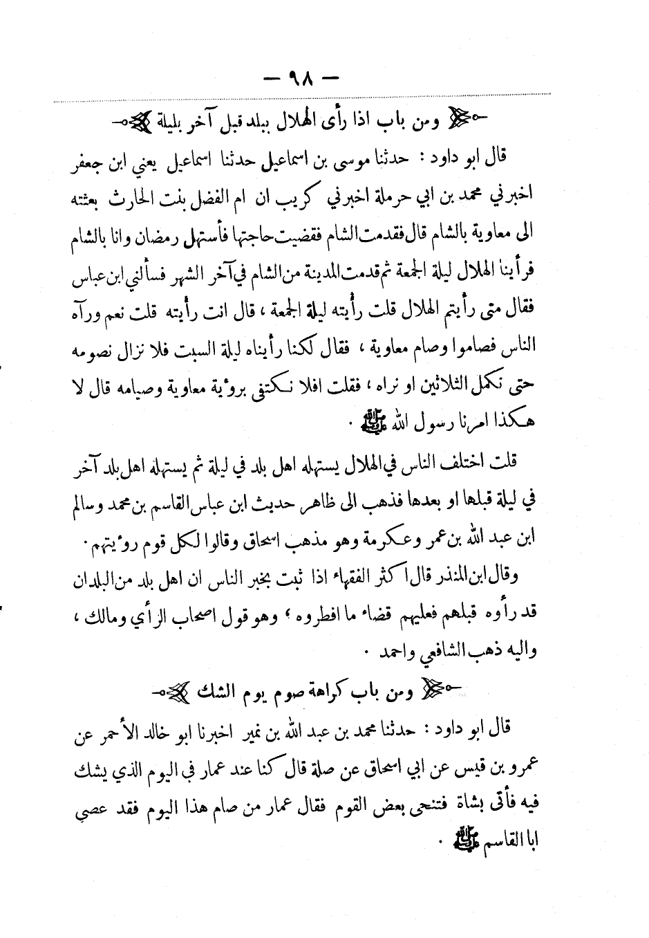 قال أبو داود: حدثنا موسى بن إسماعيل حدثنا إسماعيل، يَعني ابن جعفر أخبرني محمد بن أبي حرمله أخبرني كريب أن أم الفضل بنت الحارث بعثته إلى معاوية بالشام قال فقدمت الشام فقضيت حاجتها فاستهل رمضان وأنا بالشام فرأينا الهلال ليله الجمعة ثم قدمت المدينة من الشام في آخر الشهر فسألني ابن عباس فقال متى رأيتم الهلال قلت رأيته ليلة الجمعة، قال أنت رأيته قلت نعم ورآه الناس فصاموا وصام معاوية، فقال لكنا رأيناه ليلة السبت فلا نزال نصوم حتى نكمل الثلاثين أو نراه، فقلت أفلا نكتفي برؤيه معاوية وصيامه قال لا هكذا أمرنا رسول الله صلى الله عليه وسلم.