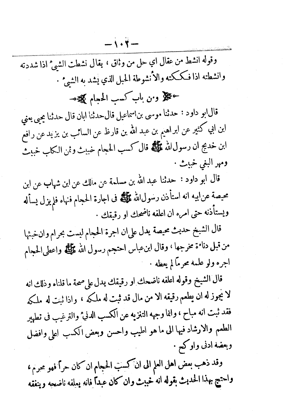 قال أبو داود: حدثنا عبد الله بن مسلمة عن مالك عن ابن شهاب عن ابن محيصة عن أبيه أنه استأذن رسول الله صلى الله عليه وسلم في إجارة الحجام فنهاه فلم يزل يسأله ويستأذنه حتى أمره أن أعلفه ناضحك أو رقيقك.