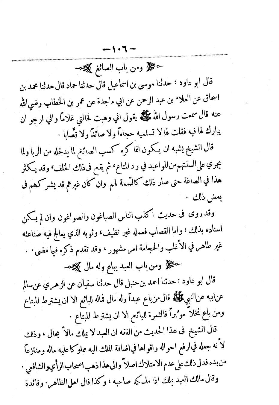 قال أبو داود: حدثنا موسى بن إسماعيل، قال: حَدَّثنا حماد، قال: حَدَّثنا محمد بن إسحاق عن العلاء بن عبد الرحمن، عَن أبي ماجدة عن عمر بن الخطاب رضي الله عنه قال سمعت رسول الله صلى الله عليه وسلم يقول إني وهبت لخالتي غلاماً وإني أرجو أن يبارك لها فيه فقلت لها لا تسلميه حجاماً ولا صائغا ولا قصَّاباً.