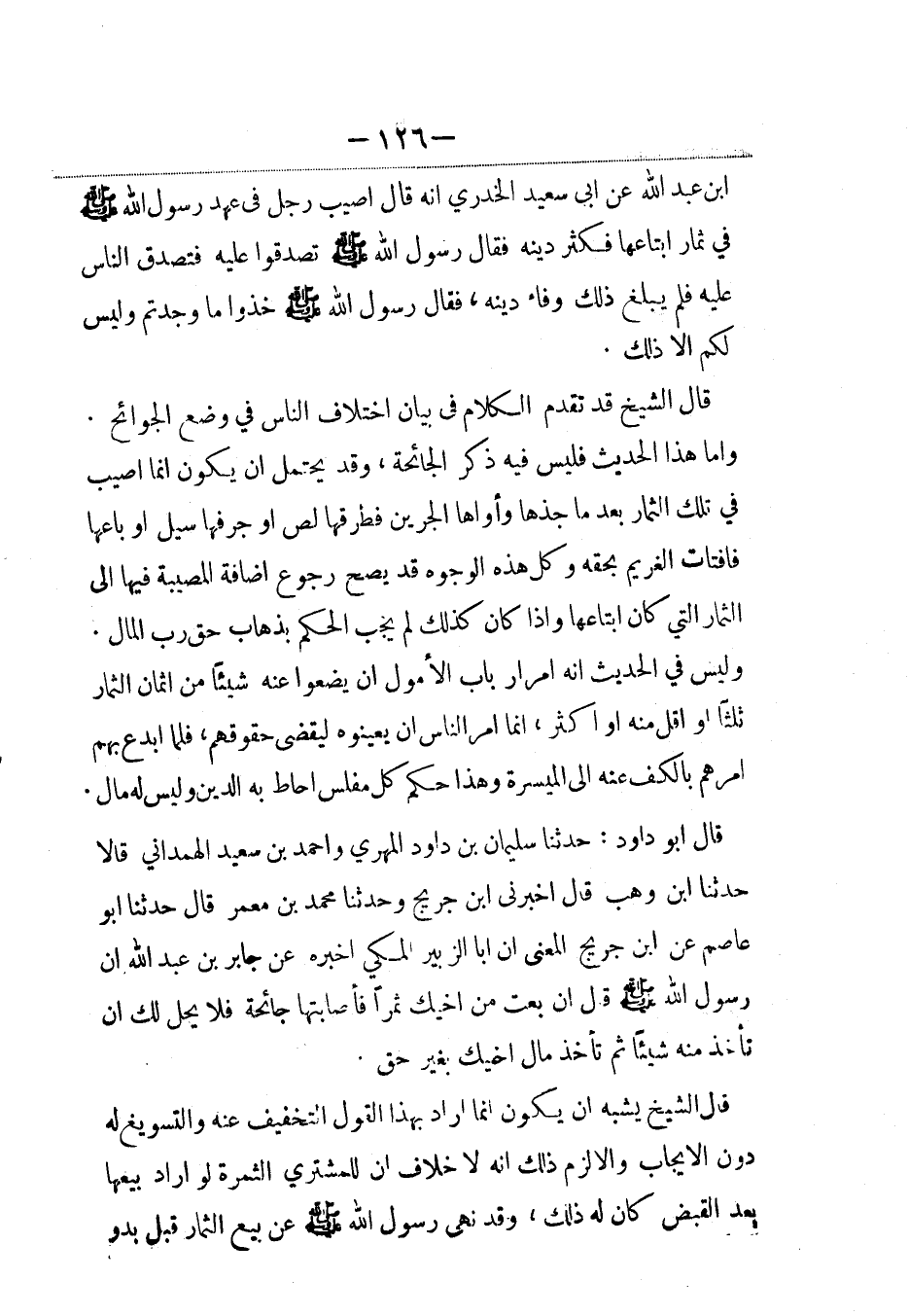 قال أبو داود: حدثنا سليمان بن داود المهري وأحمد بن سعيد الهمداني قالا: حَدَّثنا ابن وهب قال أخبرني ابن جريج وحدثنا محمد بن معمر، قال: حَدَّثنا أبو عاصم عن ابن جريج المعنى أن أبا الزبير المكي أخبره عن جابر بن عبد الله أن رسول الله صلى الله عليه وسلم قال إن بعت من أخيك ثمراً فأصابتها جائحة فلا يحل لك أن تأخذ منه شيئا ثم تأخذ مال أخيك بغير حق.