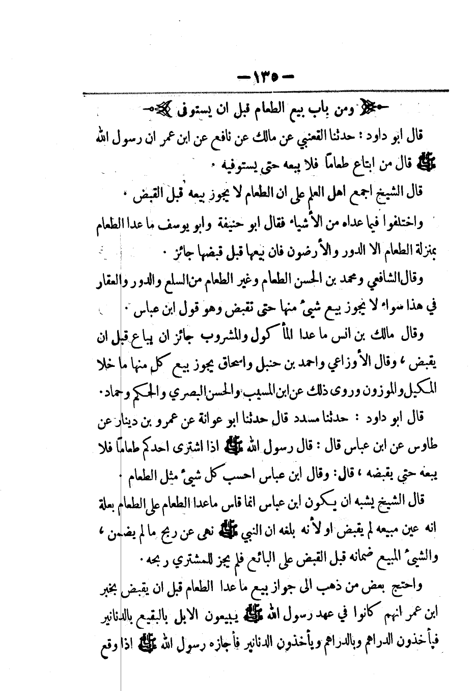 قال أبو داود: حدثنا القعنبي عن مالك عن نافع عن ابن عمر أن رسول الله صلى الله عليه وسلم قال من ابتاع طعاماً فلا يبعه حتى يستوفيه.