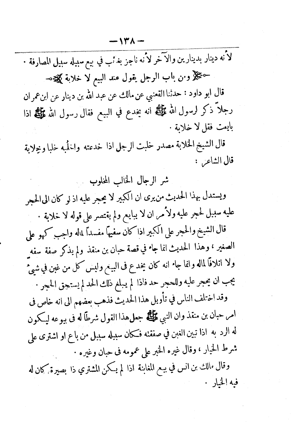 قال الشيخ والحجر على الكبير إذا كان سفيها مفسداً لماله واجب كهو على الصغير، وهذا الحديث إنما جاء في قصة حبان بن منقذ ولم يذكر صفة سفه ولا اتلافاً لماله وإنما جاء أنه كان يخدع في البيع وليس كل من غبن في شيء يجب أن يحجر عليه وللحجر حد فإذا لم يبلغ ذلك الحد لم يستحق الحجر.