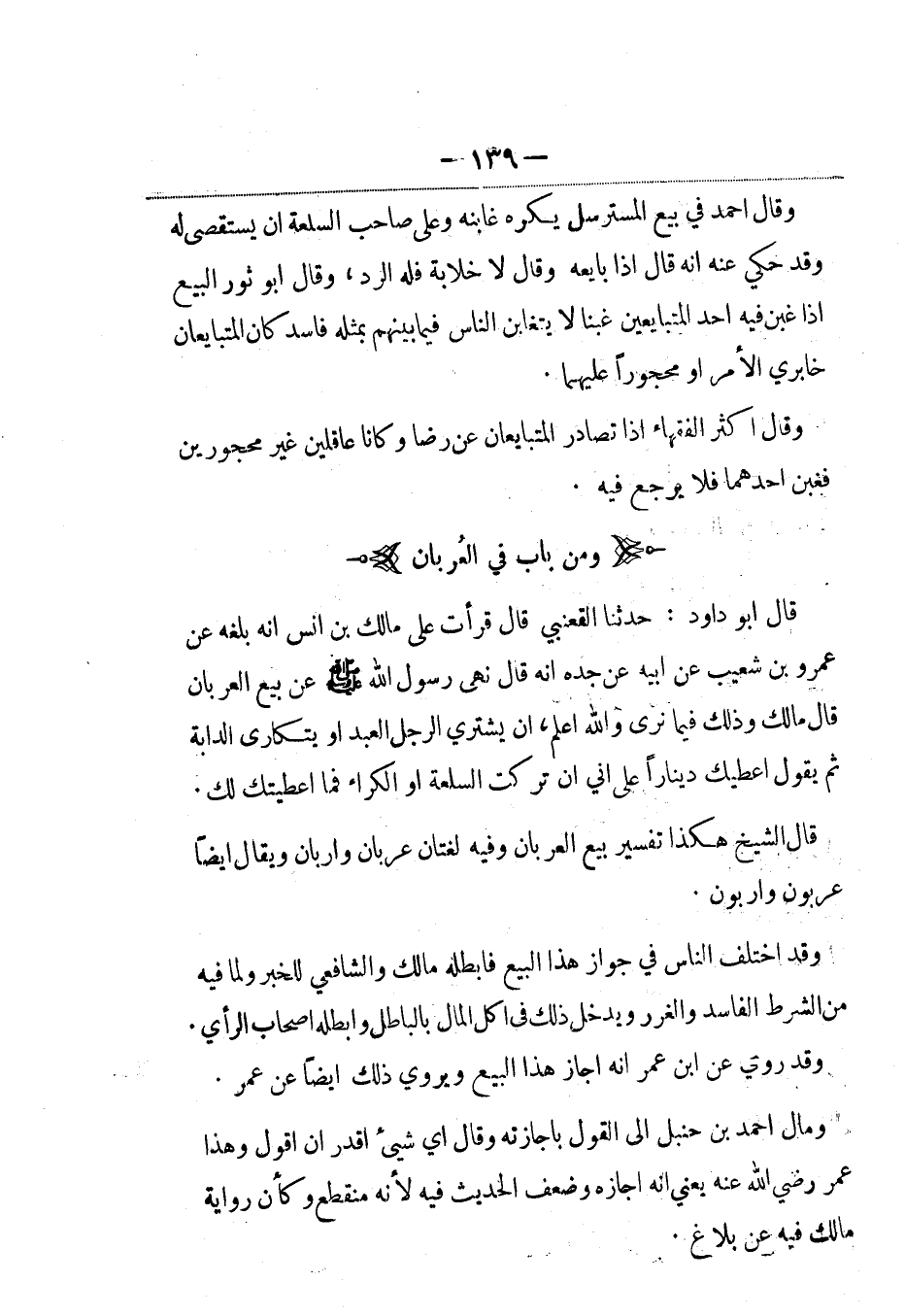 قال أبو داود: حدثنا القعنبي قال قرأت على مالك بن أنس أنه بلغه عن عمرو بن شعيب عن أبيه عن جده أنه قال نهى رسول الله صلى الله عليه وسلم عن بيع العربان قال مالك وذلك فيما نرى والله أعلم، أن يشتري الرجل العبد أو يتكارى الدابة ثم يقول أعطيك ديناراً على أني إن تركت السلعة أو الكراء فما أعطيتك لك.