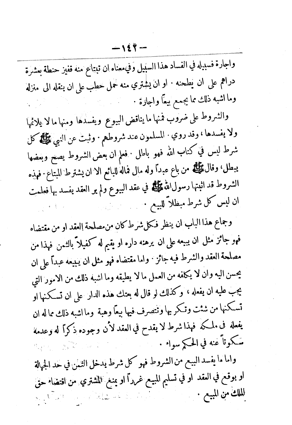 والشروط على ضروب فمنها ما يناقض البيوع ويفسدها ومنها ما لا يلائمها ولا يفسدها، وقد روي المسلمون عند شروطهم وثبت عن النبي صلى الله عليه وسلم كل شرط ليس في كتاب الله فهوباطل. فعلم أن بعض الشروط يصح وبعضها يبطل، وقال صلى الله عليه وسلم من باع عبداً وله مال فماله للبائع إلاّ أن يشترط المبتاع. فهذه الشروط قد أثبتها رسول الله صلى الله عليه وسلم في عقد البيع ولم يرد العقد يفسد بها فعلمت أن ليس كل شرط مبطلاً للبيع.