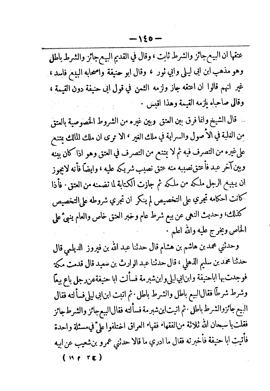وحدثني محمد بن هاشم بن هشام، قال: حَدَّثنا عبد الله بن فيروز الديلمي، قال: حَدَّثنا محمد بن سليم الذهلي،، قال: حَدَّثنا عبد الوارث بن سعيد قال قدمت مكة فوجدت بها أبا حنيفة وابن أبي ليلى وابن شبرمة فسألت أبا حنيفة عن رجل باع بيعاً وشرط شرطاً فقال البيع باطل والشرط باطل. ثم أتيت ابن أبي ليلى فسألته فقال البيع جائز والنشرط باطل. ثم أتيت ابن شبرمة فسألته فقال البيع جائز والشرط جائز فقلت يا سبحان الله ثلاثة من الفقهاء فقهاء العراق اختلفوا علي في مسألة واحدة فأتيت أبا حنيفة فأخبرته فقال ما أدري ما قالا حدثني عمرو بن شعيب عن أبيه
