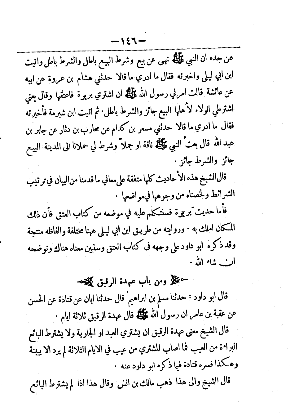 عن جده أن النبي صلى الله عليه وسلم نهى عن بيع وشرط البيع باطل والشرط باطل وأتيت ابن أبي ليلى وأخبرته فقال ما أدري ما قالا حدثني هشام بن عروة عن أبيه عن عائشة قالث أمرني رسول الله صلى الله عليه وسلم أن أشتري بريرة فأعتقها وقال يعنى اشترطي الولاء لأهلها البيع جائز والشرط باطل. ثم أتيت ابن شبرمة فأخبرته فقال ما أدري ما قالا حدثني مسعر بن كدام عن محارب بن دثار عن جابر بن عبد الله قال بعت النبي صلى الله عليه وسلم ناقة أو جملاً وشرط لي حملاناً إلى المدينة البيع جائز والشرط جائز.