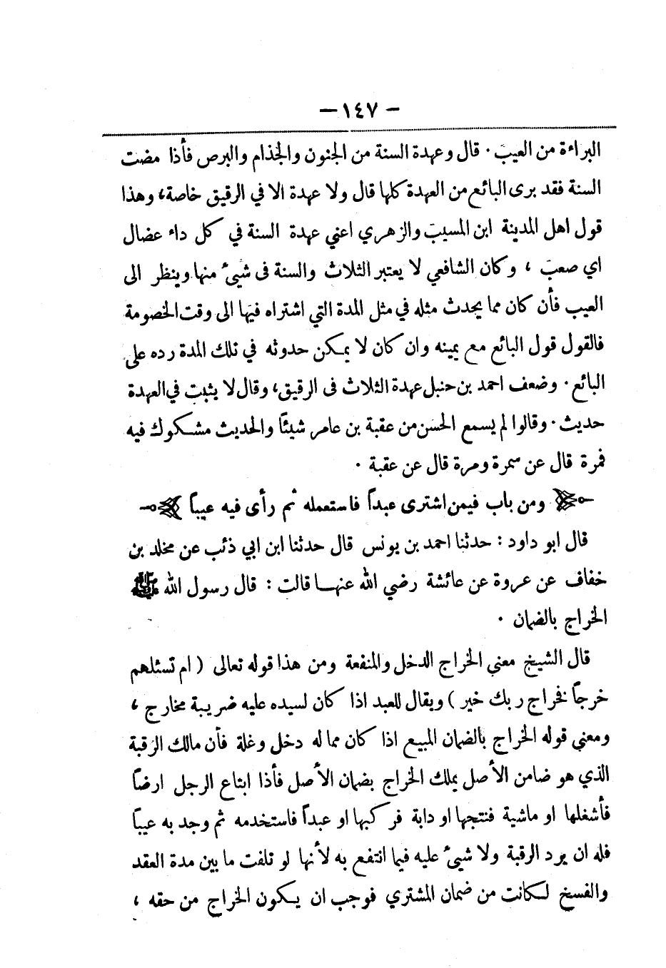 البراءة من العيب. قال وعهدة السنة من الجنون والجذام والبرص فإذا مضت السنة فقد برىء البائع من العهدة كلها قال ولا عهدة إلاّ في الرقيق خاصة، وهذا قول أهل المدينة ابن المسيب والزهري أعني عهدة السنة في كل داء عضال أي صعب، وكان الشافعي لا يعتبر الثلاث والسنة في شيء منها وينظر إلى العيب فان كان مما يحدث مثله في مثل المدة التي اشتراه فيها إلى وقت الخصومة فالقول قول البائع مع يمينه وإن كان لا يمكن حدوثه في تلك المدة رده على البائع. وضعف أحمد بن حنبل عهدة الثلاث في الرقيق، وقال لا يثبت في العهدة حديث. وقالوا لم يسمع الحسن من عقبة بن عامر شيئاً والحديث مشكوك فيه فمرة قال عن سمرة ومرة قال عن عقبة.