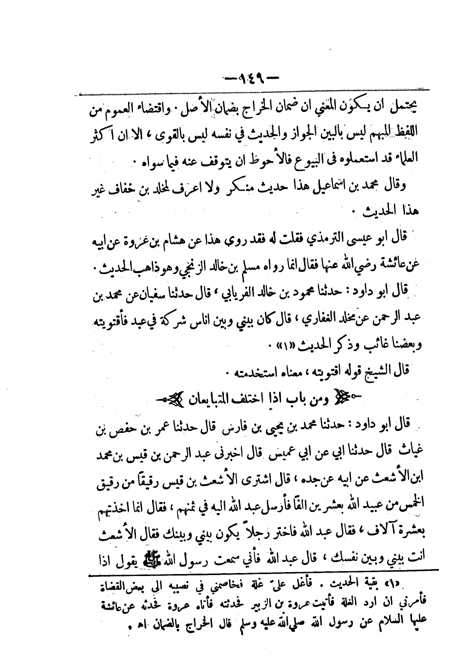 قال أبو داود: حدثنا محمد بن يحيى بن فارس، قال: حَدَّثنا عمر بن حفص بن غياث، قال: حَدَّثنا أبي، عَن أبي عميس قال أخبرني عبد الرحمن بن قيس بن محمد بن الأشعث عن أبيه عن جده، قال اشترى الأشعث بن قيس رقيقاً من رقيق الخمس من عبيد الله بعشرين ألفاً فأرسل عبد الله إليه في ثمنهم، فقال إنما أخذتهم بعشرة آلاف، فقال عبد الله فاختر رجلاً يكون بيني وبينك فقال الأشعث أنت بيني وبين نفسك، قال عبد الله فإني سمعت رسول الله صلى الله عليه وسلم يقول إذا
