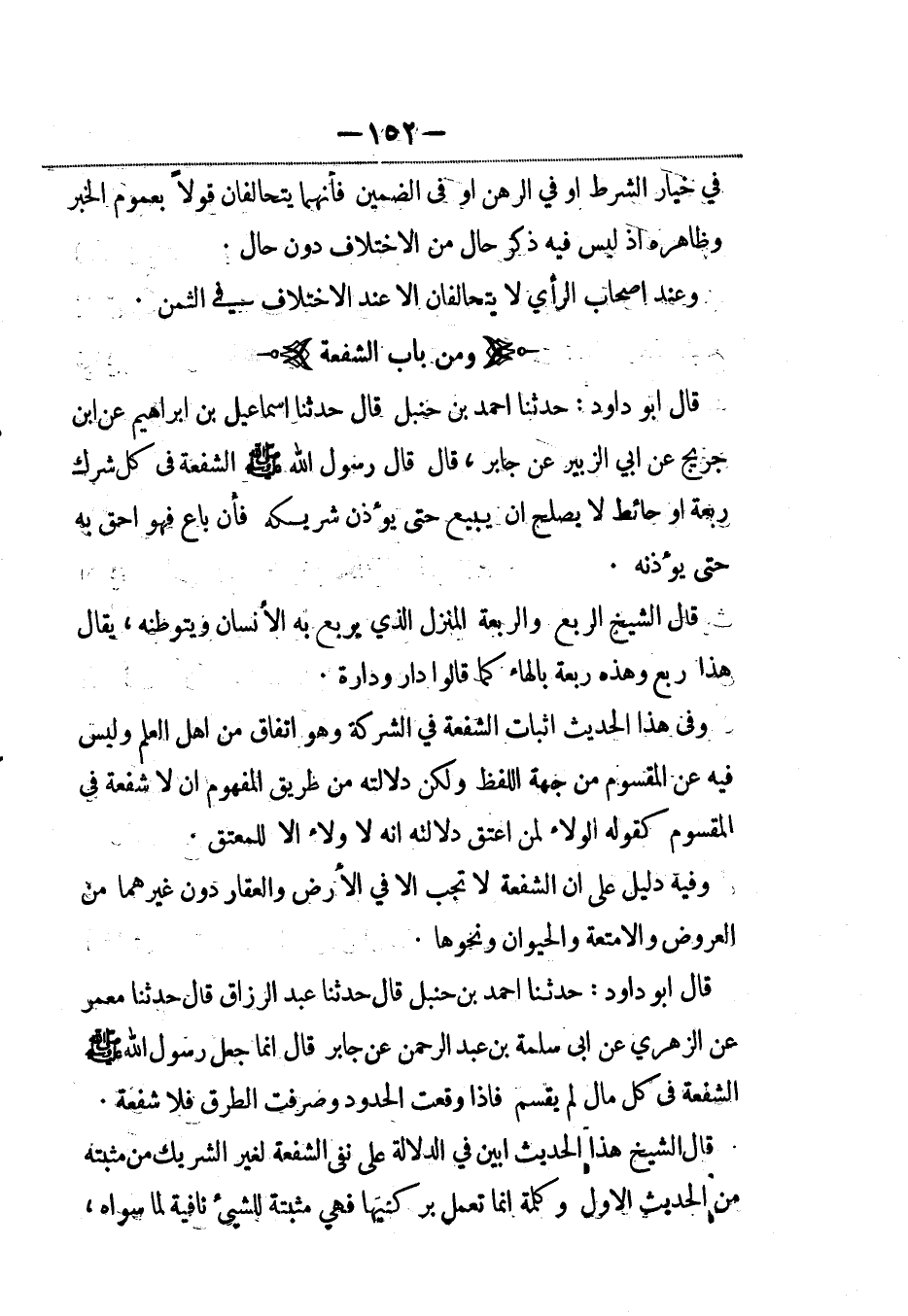 قال أبو داود: حدثنا أحمد بن حنبل، قال: حَدَّثنا إسماعيل بن إبراهيم عن ابن جريج، عَن أبي الزببر عن جابر، قال قال رسول الله صلى الله عليه وسلم الشفعة في كل شرك ربعة أو حائط لا يصلح أن يبيع حتى يؤذن شريكه فإن باع فهو أحق به حتى يؤذنه.