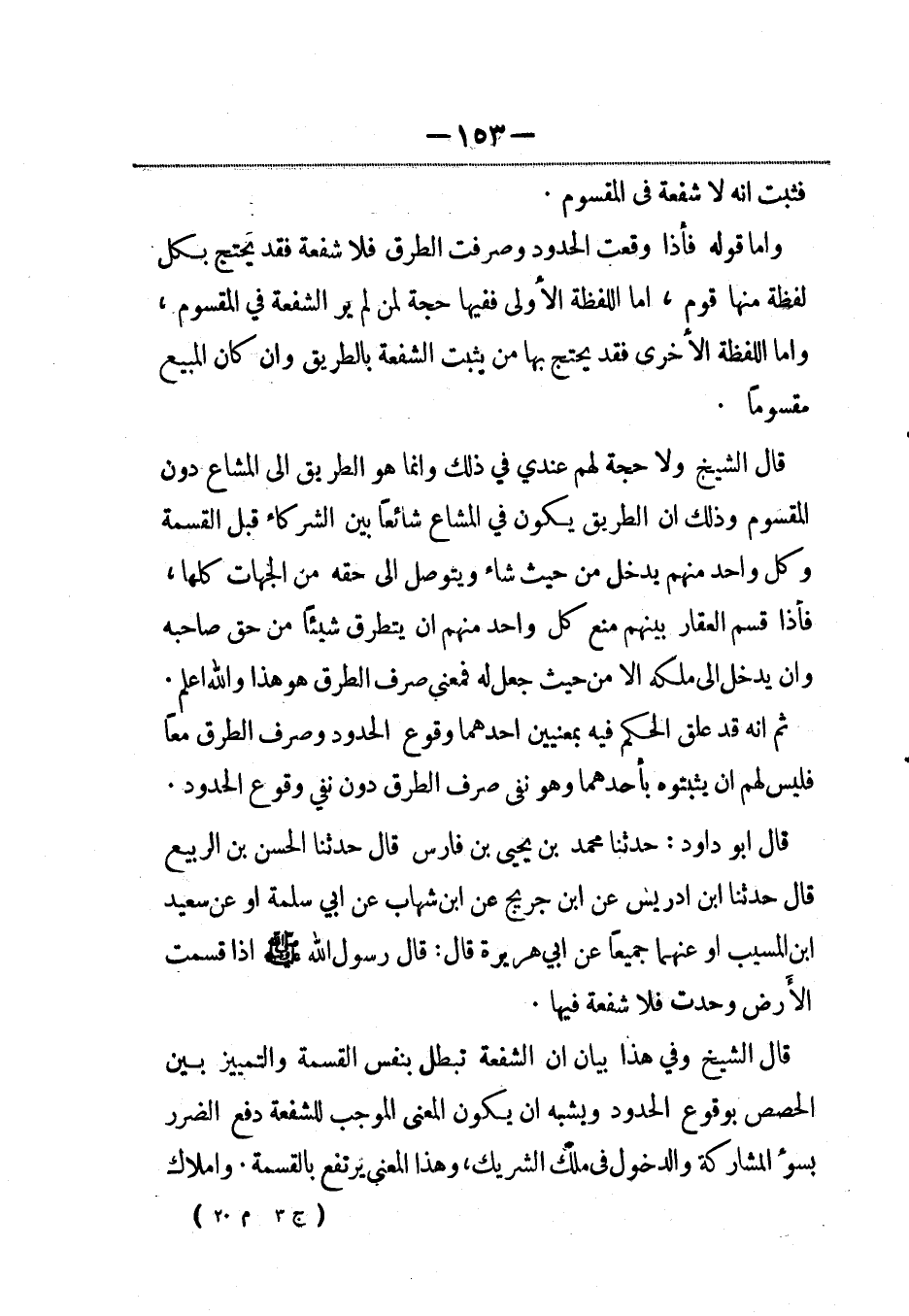 قال الشيخ ولا حجة لهم عندي في ذلك وإنما هو الطريق إلى المشاع دون المقسوم وذلك أن الطريق يكون في المشاع شائعاً بين الشركاء قبل القسمة وكل واحد منهم يدخل من حيث شاء ويتوصل إلى حقه من الجهات كلها، فإذا قسم العقار بينهم منع كل واحد منهم أن يتطرق شيئاً من حق صاحبه وأن يدخل إلى ملكه إلاّ من حيث جعل له فمعنى صرف الطرق هو هذا والله أعلم.