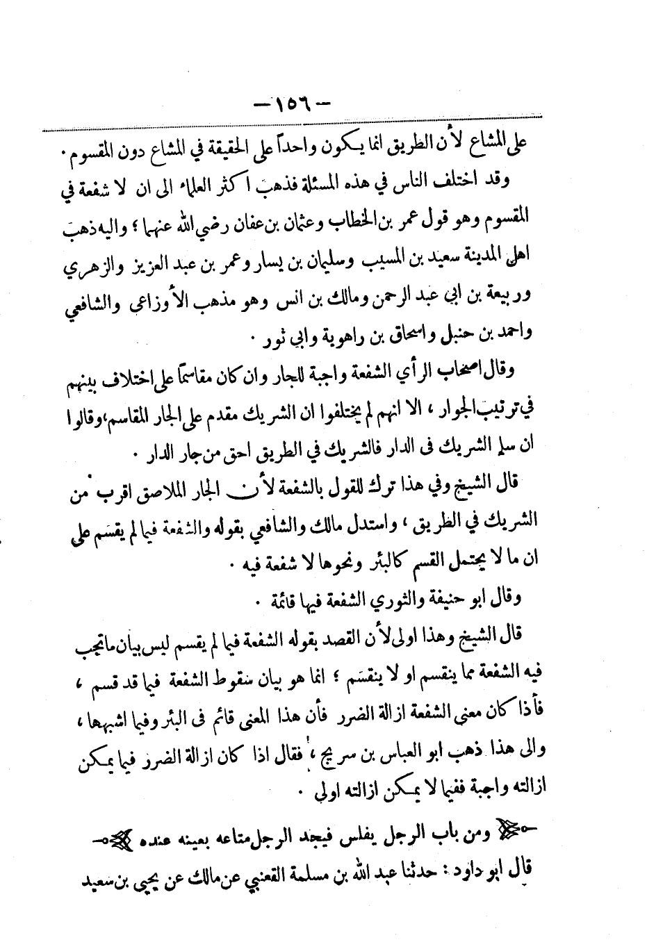 قال الشيخ وفي هذا ترك للقول بالشفعة لأن الجار الملاصق أقرب من الشريك في الطريق، واستدل مالك والشافعي بقوله والشفعة فيما لم يقسم على أن ما لا يحتمل القسم كالبئر ونحوها لا شفعة فيه.