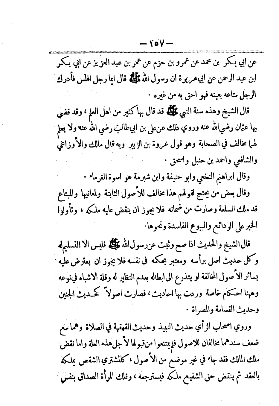 قال الشيخ والحديث إذا صح وثبت عن رسول الله صلى الله عليه وسلم فليس إلاّ التسليم له وكل حديث أصل برأسه ومعتبر بحكمه في نفسه فلا يجوز أن يعترض عليه بسائر الأصول المخالفة أو يتذرع إلى إبطاله بعدم النظير له وقلة الاشباه في نوعه وههنا أحكام خاصة وردت بها أحاديث، فصارت أصولاً كحديث الجنين وحديث القسامة والمصراة.