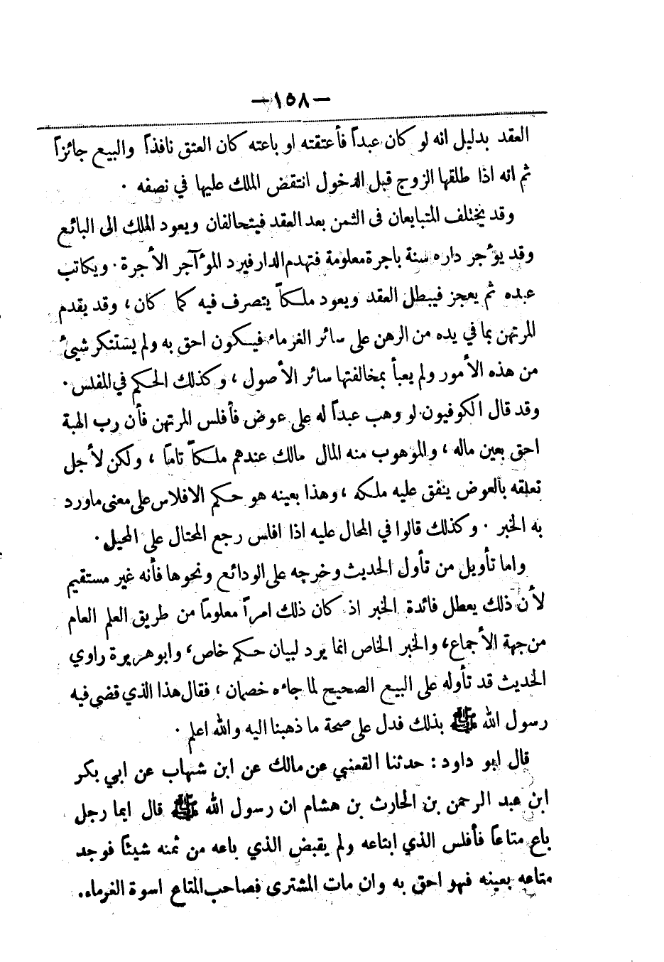 وأما تأويل من تأول الحديث وخرجه على الودائع ونحوها فإنه غير مستقيم لأن ذلك يعطل فائدة الخبر إذ كان ذلك أمراً معلوماً من طريق العلم العام من جهة الإجماع، والخبر الخاص إنما يرد لبيان حكم خاص، وأبو هريرة راوي الحديث قد تأوله على البيع الصحيح لما جاءه خصمان، فقال هذا الذي قضى فيه رسول الله صلى الله عليه وسلم بذلك فدل على صحة ما ذهبنا إليه والله أعلم.