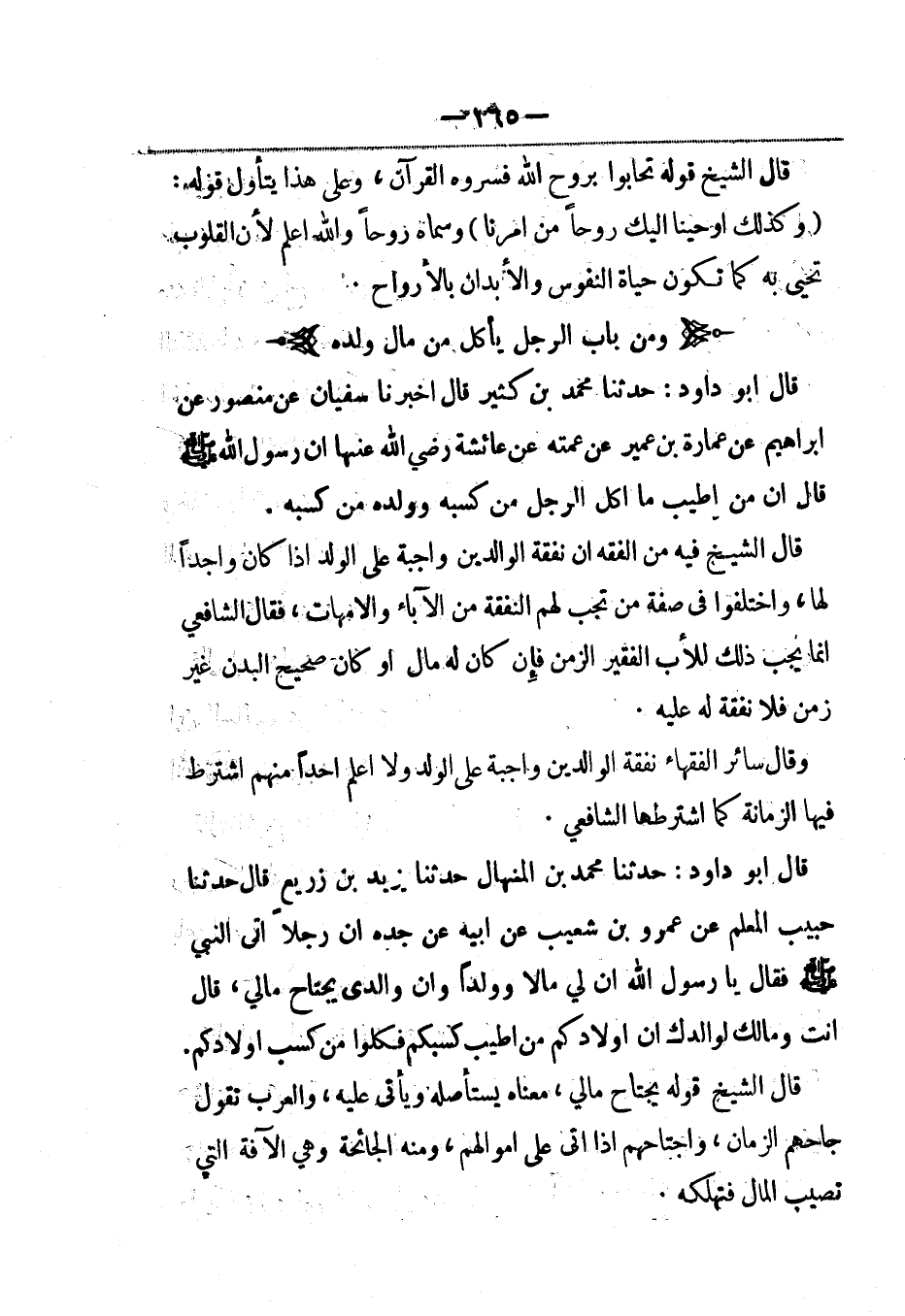 قال أبو داود: حدثنا محمد بن المنهال حدثنا يزيد بن زريع، قال: حَدَّثنا حبيب المعلم عن عمرو بن شعيب عن أبيه عن جده أن رجلاً أتى النبي صلى الله عليه وسلم فقال يا رسول الله صلى الله عليه وسلم إن لي مالاً وولداً وإن والدي يجتاح مالي، قال أنت ومالك لوالدك إن أولادكم من أطيب كسبكم فكلوا من كسب أولادكم.