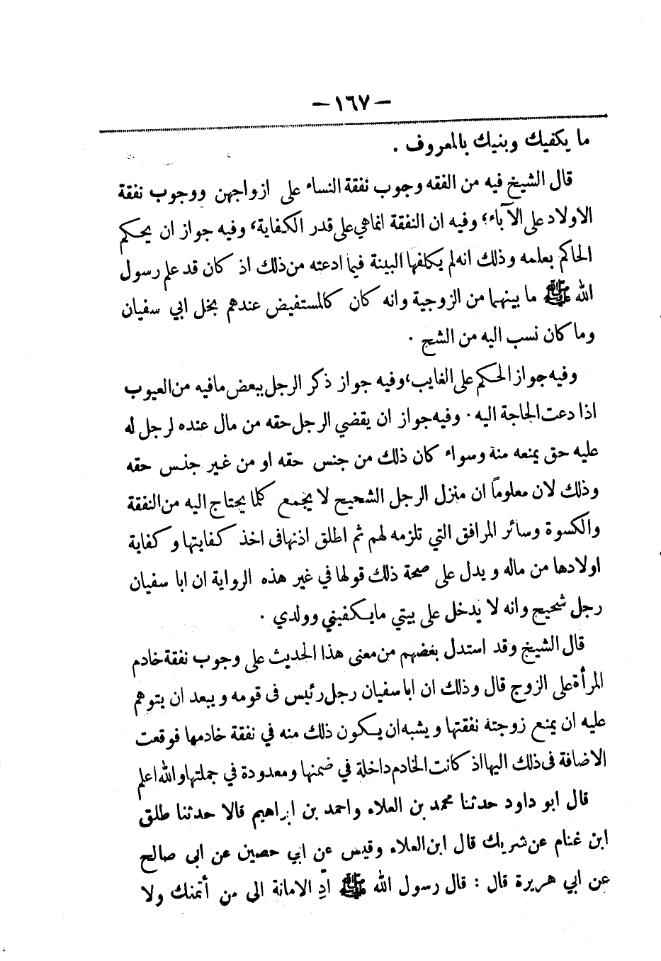 قال الشيخ فيه من الفقه وجوب نفقة النساء على أزواجهن ووجوب نفقة الأولاد على الآباء، وفيه أن النفقة إنما هي على قدر الكفاية، وفيه جواز أن يحكم الحاكم بعلمه وذلك أنه لم يكلفها البينة فيما أدعته من ذلك إذ كان قد علم رسول الله صلى الله عليه وسلم ما بينهما من الزوجية وأنه كان كالمستفيض عندهم بخل أبي سفيان وما كان نسب إليه من الشح.