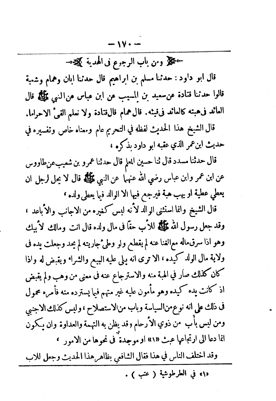 قال أبو داود: حدثنا مسلم بن إبراهيم، قال: حَدَّثنا أبان وهمام وشعبة قالوا حدثنا قتادة عن سعيد بن المسيب عن ابن عباس عن النبي صلى الله عليه وسلم قال العائد في هبته كالعائد في قيئه. قال همام قال قتادة ولا نعلم القيء إلاّ حراماً.