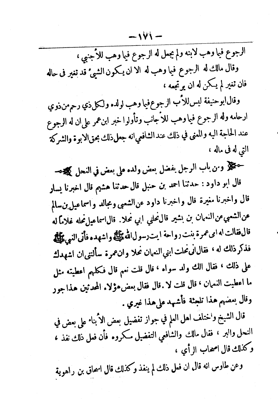 قال أبو داود: حدثنا أحمد بن حنبل، قال: حَدَّثنا هشيم قال أخبرنا يسار قال وأخبرنا مغيرة قال وأخبرنا داود عن الشعبي ومجالد وإسماعيل بن سالم عن الشعبي عن النعمان بن بشير قال نحلني أبي نحلاً. قال إسماعيل نحله غلاماً له قال فقالت له أمي عمرة بنت رواحة ايت رسول الله صلى الله عليه وسلم وأشهده فأتى النبي صلى الله عليه وسلم فذكر ذلك لم، فقال إني نحلت ابني النعمان نحلاً وأن عمرة سألتني أن أشهدك على ذلك، فقال ألك ولد سواه، قال قلت نعم قال فكلهم أعطيته مثل ما أعطيت النعمان، قال قلت لا قال فقال بعض هؤلاء المحدثين هذا جور وقال بعضهم هذا تلجئة فأشهد على هذا غيري.