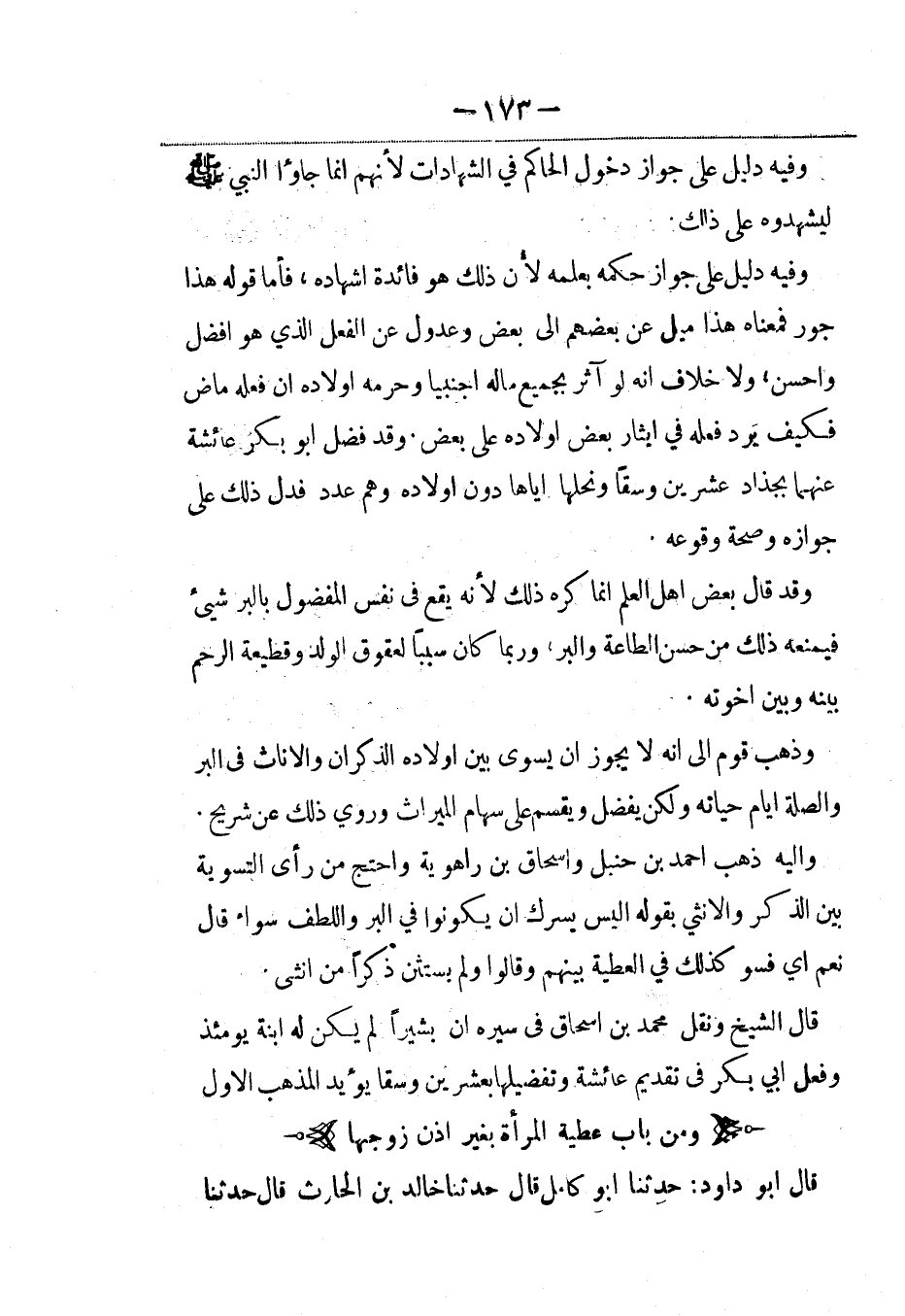 وفيه دليل على جواز حكمه بعلمه لأن ذلك هو فائدة إشهاده، فأما قوله هذا جور فمعناه هذا ميل عن بعضهم إلى بعض وعدول عن الفعل الذي هو أفضل وأحسن، ولا خلاف أنه لو آثر بجميع ماله أجنبيا وحرمه أولاده أن فعله ماض فكيف يرد فعله في إيثار بعض أولاده على بعض. وقد فضل أبو بكر عائشة عنهما بجداد عشرين وسقاً ونحلها إياها دون أولاده وهم عدد فدل ذلك على جوازه وصحة وقوعه.