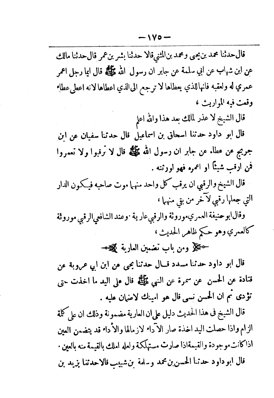 قال أبو داود: حدثنا إسحاق بن إسماعيل، قال: حَدَّثنا سفيان عن ابن جريج عن عطاء عن جابر أن رسول الله صلى الله عليه وسلم قال لا ترقبوا ولا تعمروا فمن ارقب شيئاً أو اعمره فهو لورثته.