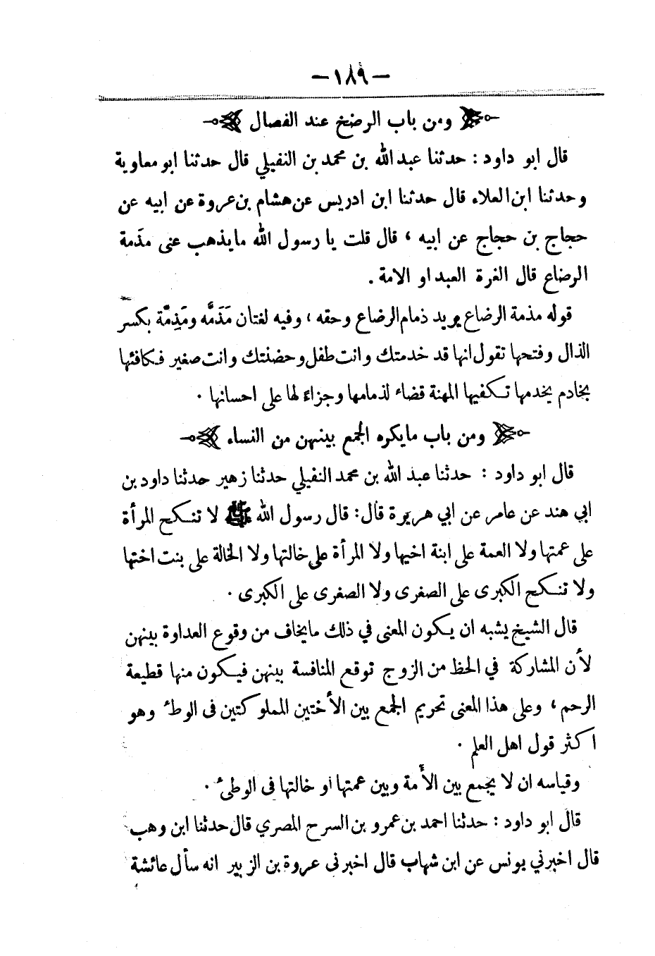 قال أبو داود: حدثنا عبد الله بن محمد النفيلي حدثنا زهير حدثنا داود بن أبي هند عن عامر، عَن أبي هريرة قال: قال رسول الله صلى الله عليه وسلم: لا تنكح المرأة على عمتها ولا العمة على ابنة أخيها ولا المرأة على خالتها ولا الخالة على بنت أختها ولا تنكح الكبرى على الصغرى ولا الصغرى على الكبرى.