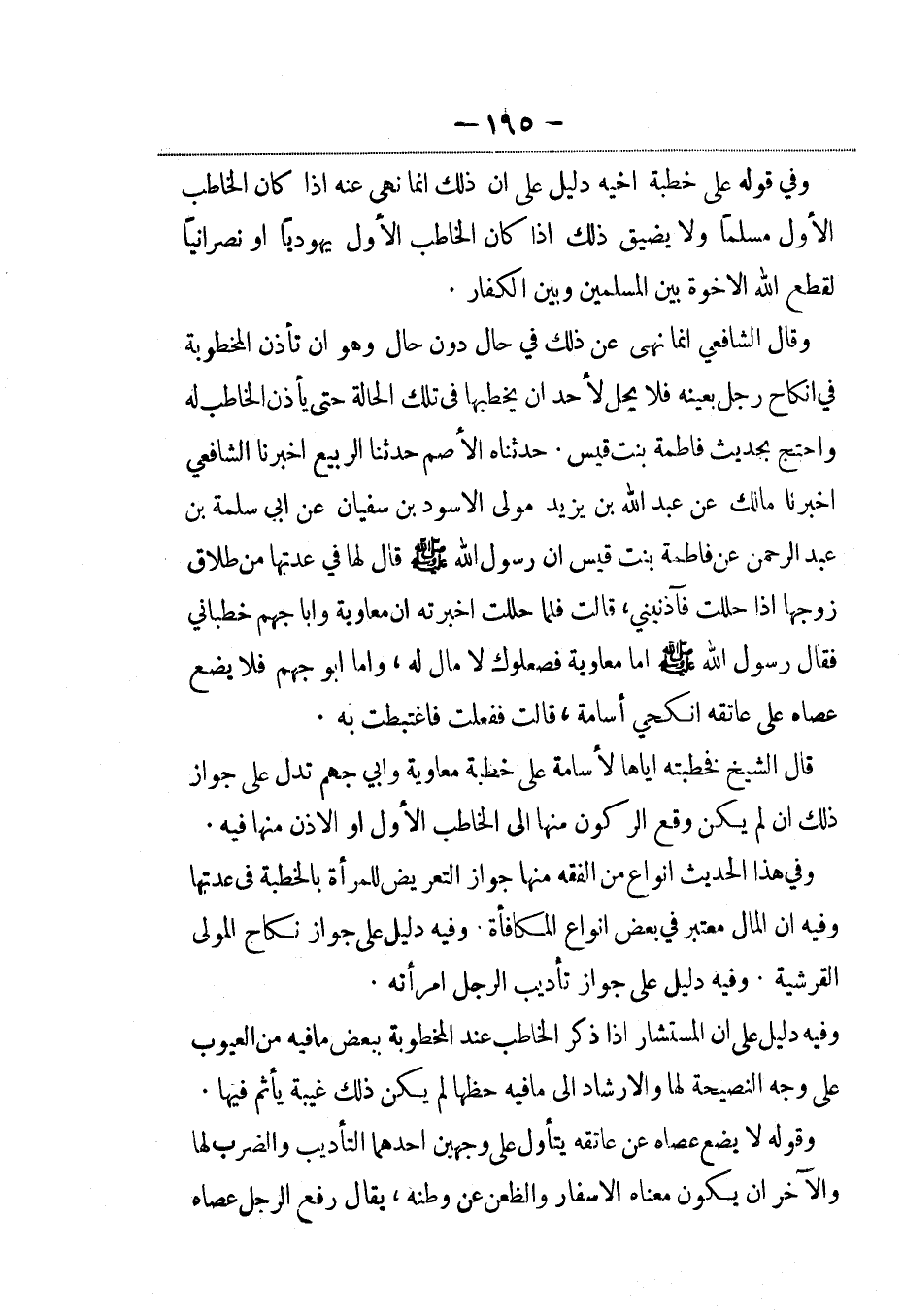وقال الشافعي إنما نهي عن ذلك في حال دون حال وهو أن تأذن المخطوبة في إنكاح رجل بعينه فلا يحل لأحد أن يخطبها في تلك الحالة حتى يأذن الخاطب له واحتج بحديث فاطمة بنت قيس. حدثناه الأصم حدثنا الربيع أخبرنا الشافعي أخبرنا مالك عن عبد الله بن يزيد مولى الأسود بن سفيان، عَن أبي سلمة بن عبد الرحمن عن فاطمة بنت قيس أن رسول الله صلى الله عليه وسلم قال لها في عدتها من طلاق زوجها إذا حللت فآذنيني، قالت فلما حللت أخبرته أن معاوية وأبا جهم خطباني فقال رسول الله صلى الله عليه وسلم أما معاوية فصعلوك لا مال له، وأما أبو جهم فلا يضع عصاه على عاتقه أنكحي أسامة، قالت ففعلت فاغتبطت به.