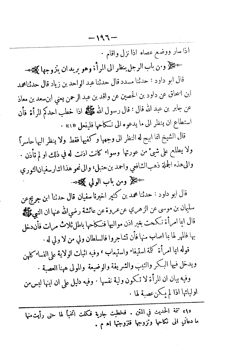 قال أبو داود: حدثنا مسدد، قال: حَدَّثنا عبد الواحد بن زياد، قال: حَدَّثنا محمد بن إسحاق عن داود بن الحصين عن واقد بن عبد الرحمن، يَعني ابن سعد بن معاذ عن جابر بن عبد الله قال: قال رسول الله صلى الله عليه وسلم: إذا خطب أحدكم المرأة فإن استطاع أن ينظر إلى ما يدعوه إلى نكاحها فليفعل.