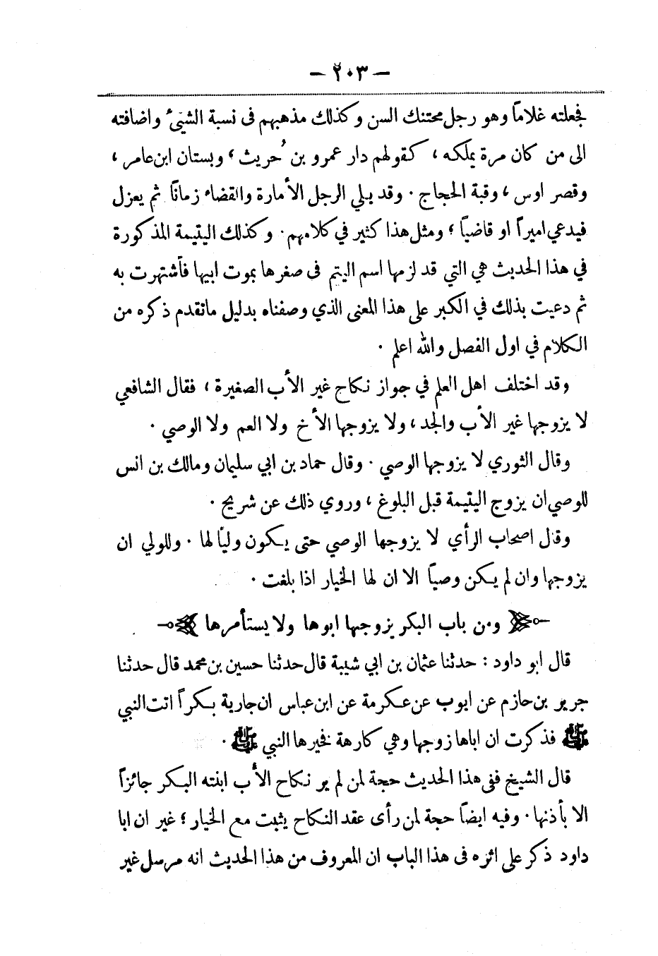 قال أبو داود: حدثنا عثمان بن أبي شيبة، قال: حَدَّثنا حسين بن محمد، قال: حَدَّثنا جرير بن حازم عن أيوب عن عكرمة عن ابن عباس أن جارية بكراً أتت النبي صلى الله عليه وسلم فذكرت أن أباها زوجها وهي كارهة فخيرها النبي صلى الله عليه وسلم.