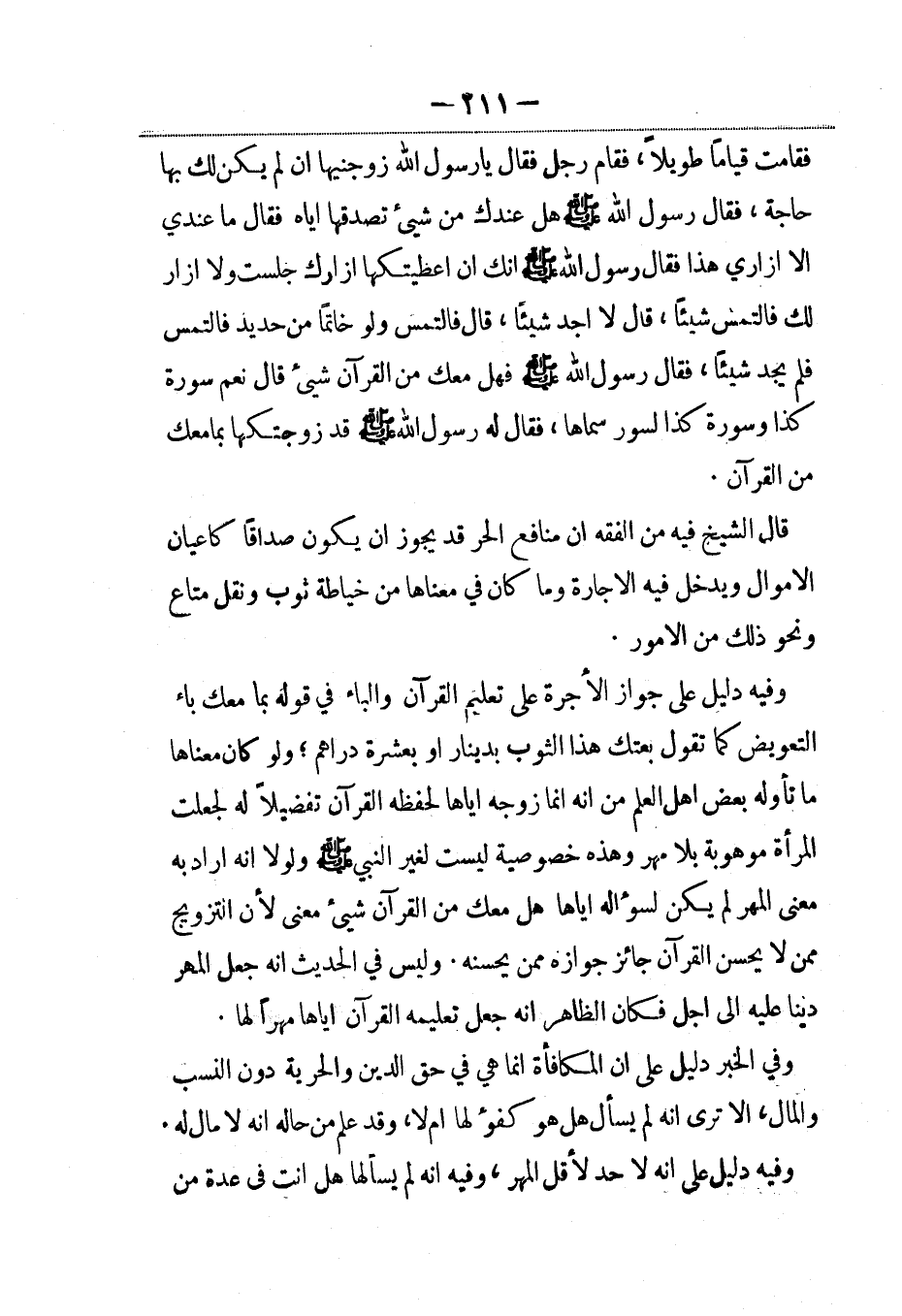 فقامت قياما طويلاً، فقام رجل فقال يا رسول الله زوجنيها إن لم يكن لك بها حاجة، فقال رسول الله صلى الله عليه وسلم: هل عندك من شيء تصدقها إياه فقال ما عندي إلاّ إزاري هذا فقال رسول الله صلى الله عليه وسلم إنك إن أعطيتها إزارك جلست ولا إزار لك فالتمس شيئاً، قال لا أجد شيئاً، قال فالتمس ولو خاتما من حديد فالتمس فلم يجد شيئا، فقال رسول الله صلى الله عليه وسلم: فهل معك من القرآن شيء قال نعم سورة كذا وسورة كذا لسور سماها، فقال له رسول الله صلى الله عليه وسلم: قد زوجتكها بما معك من القرآن.