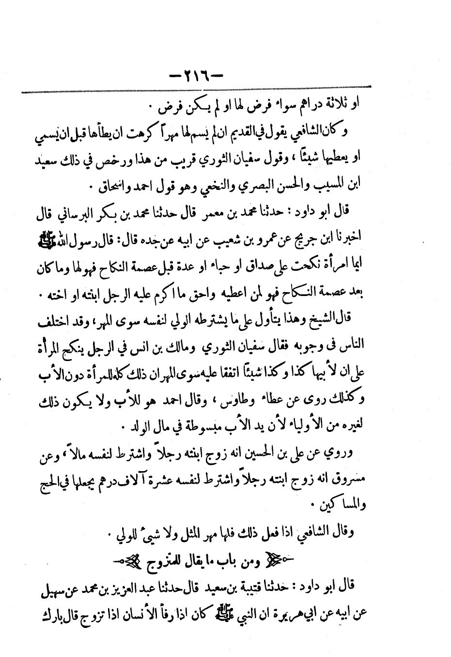 قال أبو داود: حدثنا محمد بن معمر، قال: حَدَّثنا محمد بن بكر البرساني قال أخبرنا ابن جريج عن عمرو بن شعيب عن أبيه عن جده قال: قال رسول الله صلى الله عليه وسلم: أيما امرأة نكحت على صداق أو حباء أو عدة قبل عصمة النكاح فهو لها وما كان بعد عصمة النكاح فهو لمن أعطيه وأحق ما أكرم عليه الرجل ابنته أو أخته.