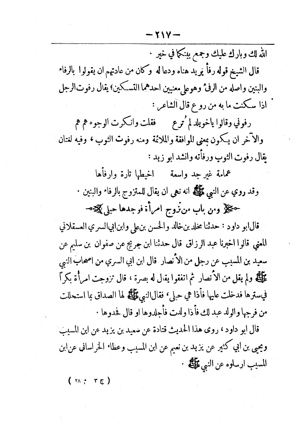 قال الشيخ قوله رفأ يريد هناه ودعا له وكان من عادتهم أن يقولوا بالرفاء والبنين وأصله من الرفىء وهو على معنيين أحدهما التسكين؛ يقال رفوت الرجل إذا سكنت ما به من روع قال الشاعر: