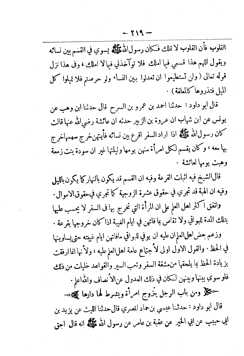 قال أبو داود: حدثنا أحمد بن عمرو بن السرح، قال: حَدَّثنا ابن وهب عن يونس عن ابن شهاب أن عروة بن الزبير حدثه أن عائشة رضي الله عنها قالت كان رسول الله صلى الله عليه وسلم إذا أراد السفر أقرع بين نسائه فأيتهن خرج سهمها خرج بها معه، وكان يقسم لكل امرأة منهن يومها وليلتها غيرأن سودة بنت زمعة وهبت يومها لعائشة.
