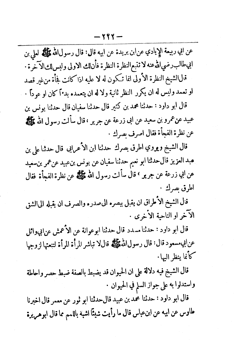 قال أبو داود: حدثنا محمد بن كثير، قال: حَدَّثنا سفيان، قال: حَدَّثنا يونس بن عبيد عن عمرو بن سعيد، عَن أبي زرعة عن جرير، قال سألت رسول الله صلى الله عليه وسلم عن نظرة الفجأة فقال اصرف بصرك.