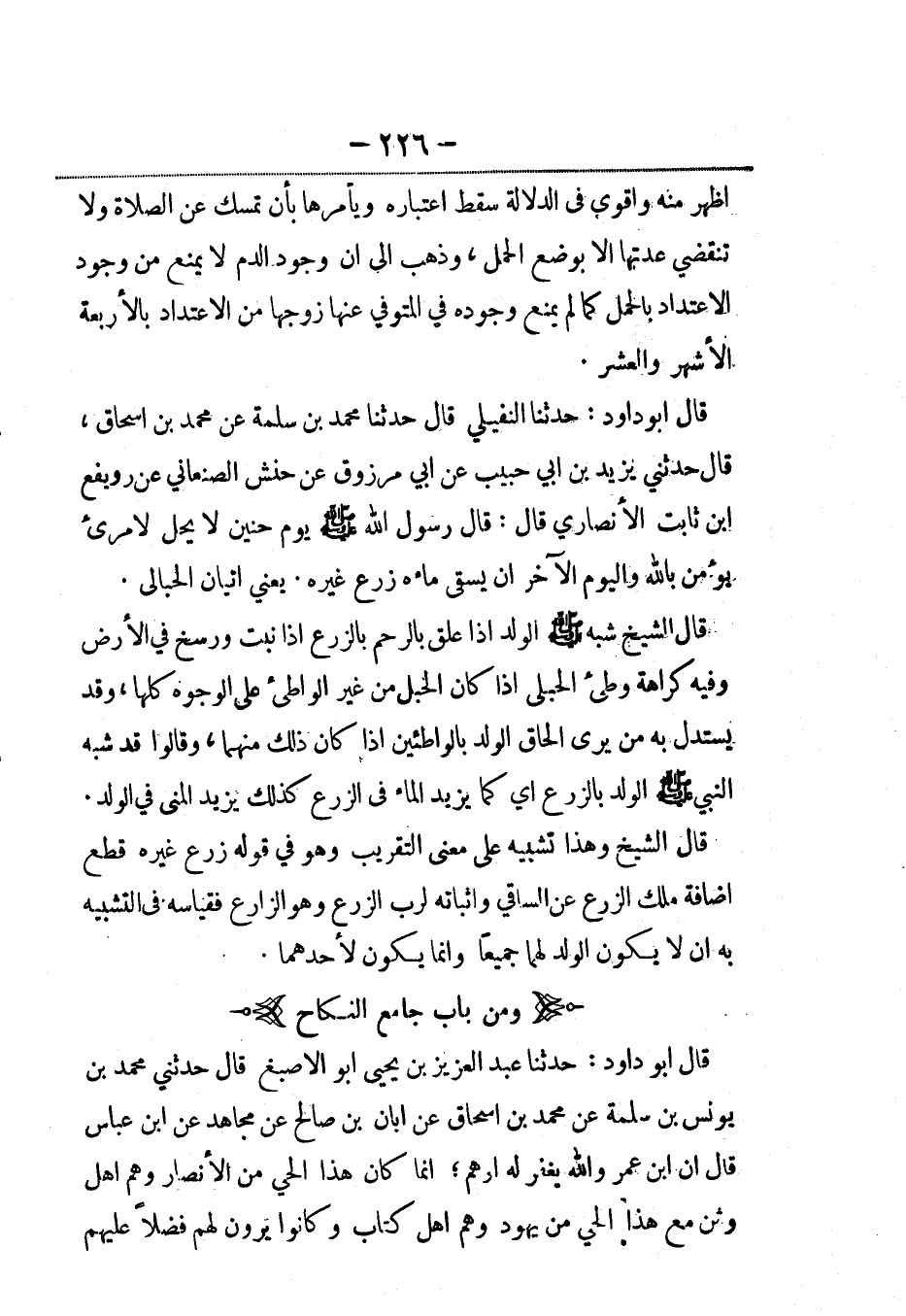 قال أبو داود: حدثنا النفيلي، قال: حَدَّثنا محمد بن سلمة عن محمد بن إسحاق، قال حدثني يزيد بن أبي حبيب، عَن أبي مرزوق عن حنش الصنعاني عن رويفع بن ثابت الأنصاري قال: قال رسول الله صلى الله عليه وسلم يوم حنين لا يحل لامرىء يؤمن بالله واليوم الآخر أن يسقي ماءه زرع غيره، يَعني اتيان الحبالى.