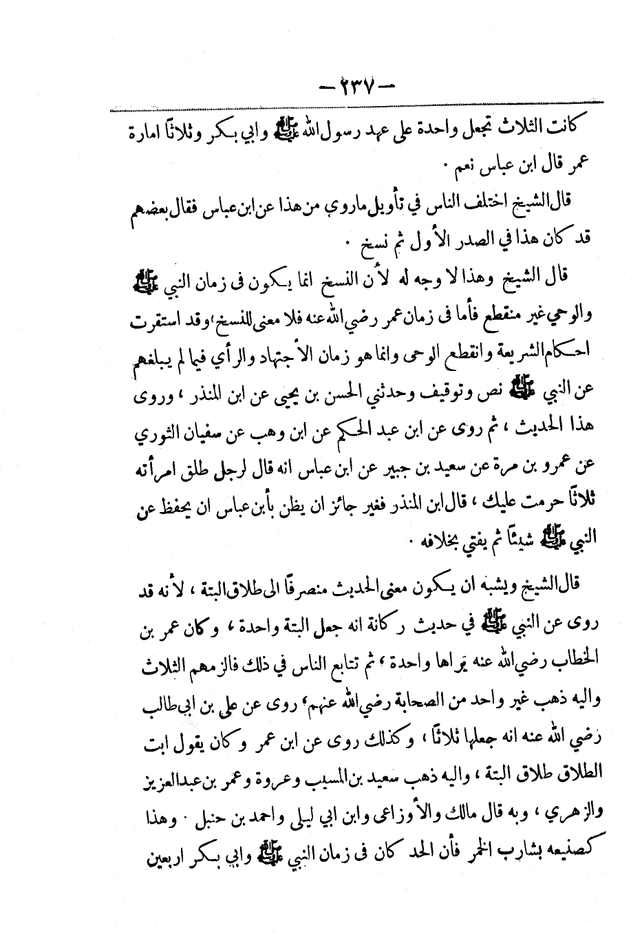 قال الشيخ وهذا لا وجه له لأن النسخ إنما يكون في زمان النبي صلى الله عليه وسلم والوحي غير منقطع فأما في زمان عمر رضي الله عنه فلا معنى للنسخ، وقد استقرت أحكام الشريعة وانقطع الوحي وإنما هو زمان الاجتهاد والرأي فيما لم يبلغهم عن النبي صلى الله عليه وسلم نص وتوقيف وحدثني الحسن بن يحيى عن ابن المنذر، وروى هذا الحديث، ثم روي عن ابن عبد الحكم عن ابن وهب عن سفيان الثوري عن عمرو بن مرة عن سعيد بن جبير عن ابن عباس أنه قال لرجل طلق امرأته ثلاثا حرمت عليك، قال ابن المنذر فغير جائز أن يظن بابن عباس أن يحفظ عن النبي صلى الله عليه وسلم شيئاً ثم يفتي بخلافه.