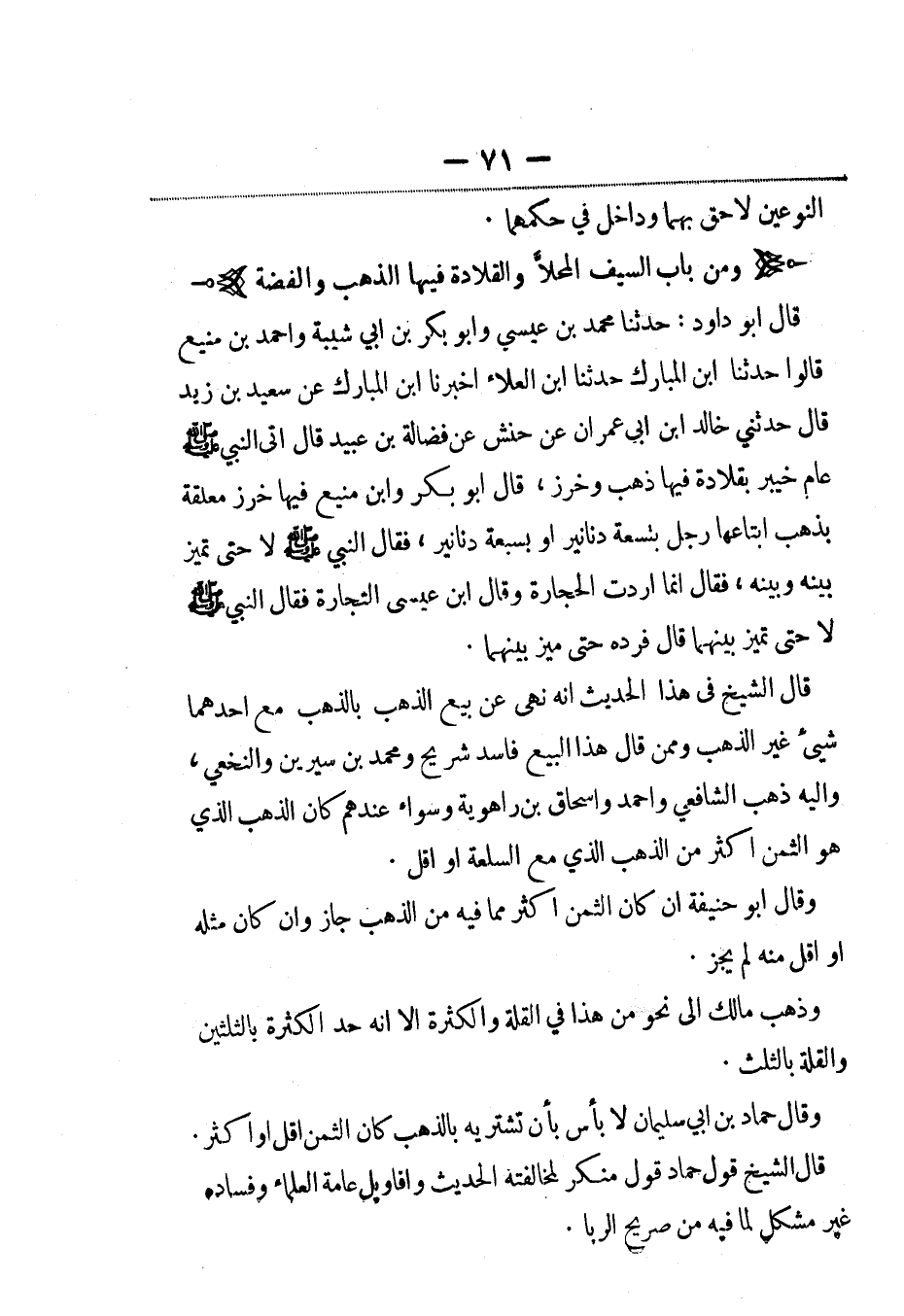 قال أبو داود: حدثنا محمد بن عيسى وأبو بكر بن أبي شيبة وأحمد بن منيع قالوا حدثنا ابن المبارك (ح) حدثنا ابن العلاء أخبرنا ابن المبارك عن سعيد بن زيد قال حدثني خالد بن أبي عمران عن حنش عن فضالة بن عبيد قال أتى النبي النبي صلى الله عليه وسلم عام خيبر بقلادة فيها ذهب وخرز، قال أبو بكر وابن منيع فيها خرز معلقة بذهب ابتاعها رجل بتسعة دنانير أو بسبعة دنانير، فقال النبي صلى الله عليه وسلم لا حتى تميز بينه وبينه، فقال إنما أردت الحجارة وقال ابن عيسى التجاره فقال النبي صلى الله عليه وسلم لا حتى تميز بينهما قال فرده حتى ميز بينهما.