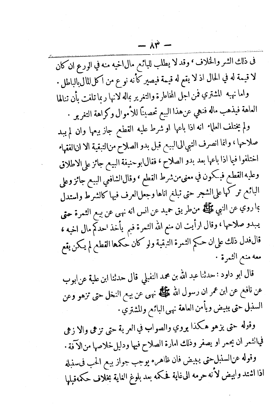 قال أبو داود: حدثنا عبد الله بن محمد النفيلي، قال: حَدَّثنا ابن علية عن أيوب عن نافع عن ابن عمر أن رسول الله صلى الله عليه وسلم نهى عن بيع النخل حتى تزهو وعن السنبل حتى يبيض ويأمن العاهة نهى البائع والمشتري.