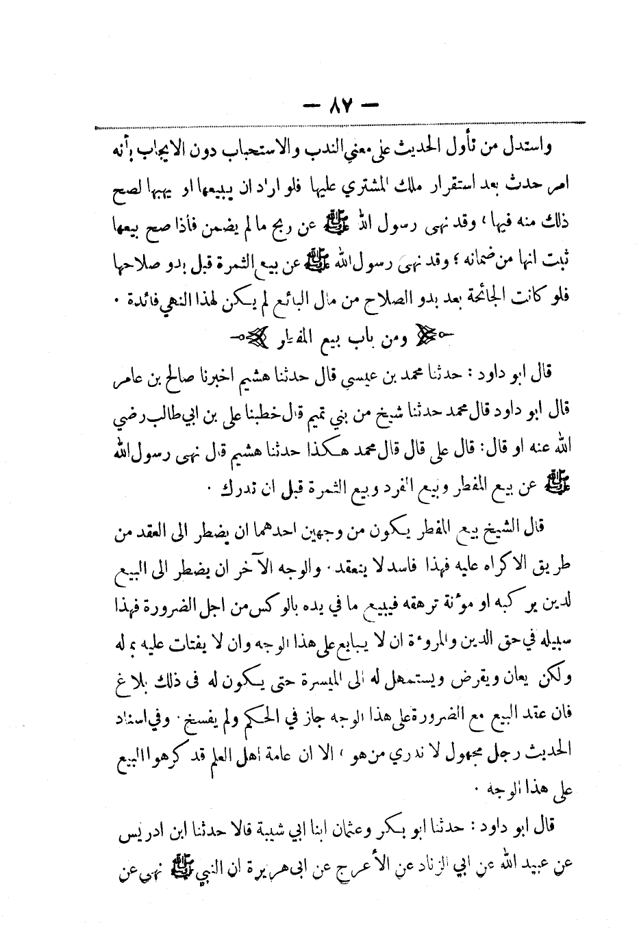 قال أبو داود: حدثنا محمد بن عيسى، قال: حَدَّثنا هشيم أخبرنا صالح بن عامر قال أبو داود قال محمد حدثنا شيخ من بني تميم قال خطبنا على بن أبي طالب رضي الله عنه أو قال: قال علي قال قال محمد هكذا حدثنا هشيم قال نهى رسول الله صلى الله عليه وسلم عن بيع المضطر وبيع الغرر وبيع الثمرة قبل أن تدرك.