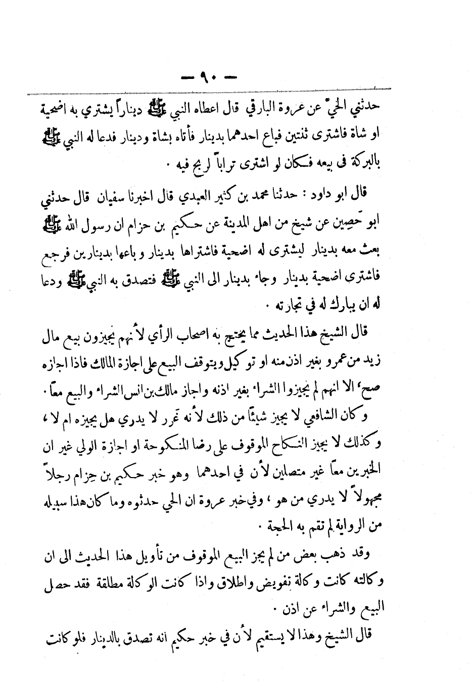 قال الشيخ هذا الحديث مما يحتج به أصحاب الرأي لأنهم يجيزون بيع مال زيد من عمرو بغير إذن منه أو توكيل ويتوقف البيع على إجازة المالك فإذا أجازه صح، إلاّ أنهم لم يجيزوا الشراء بغير إذنه وأجاز مالك بن أنس الشراء والبيع معاً.