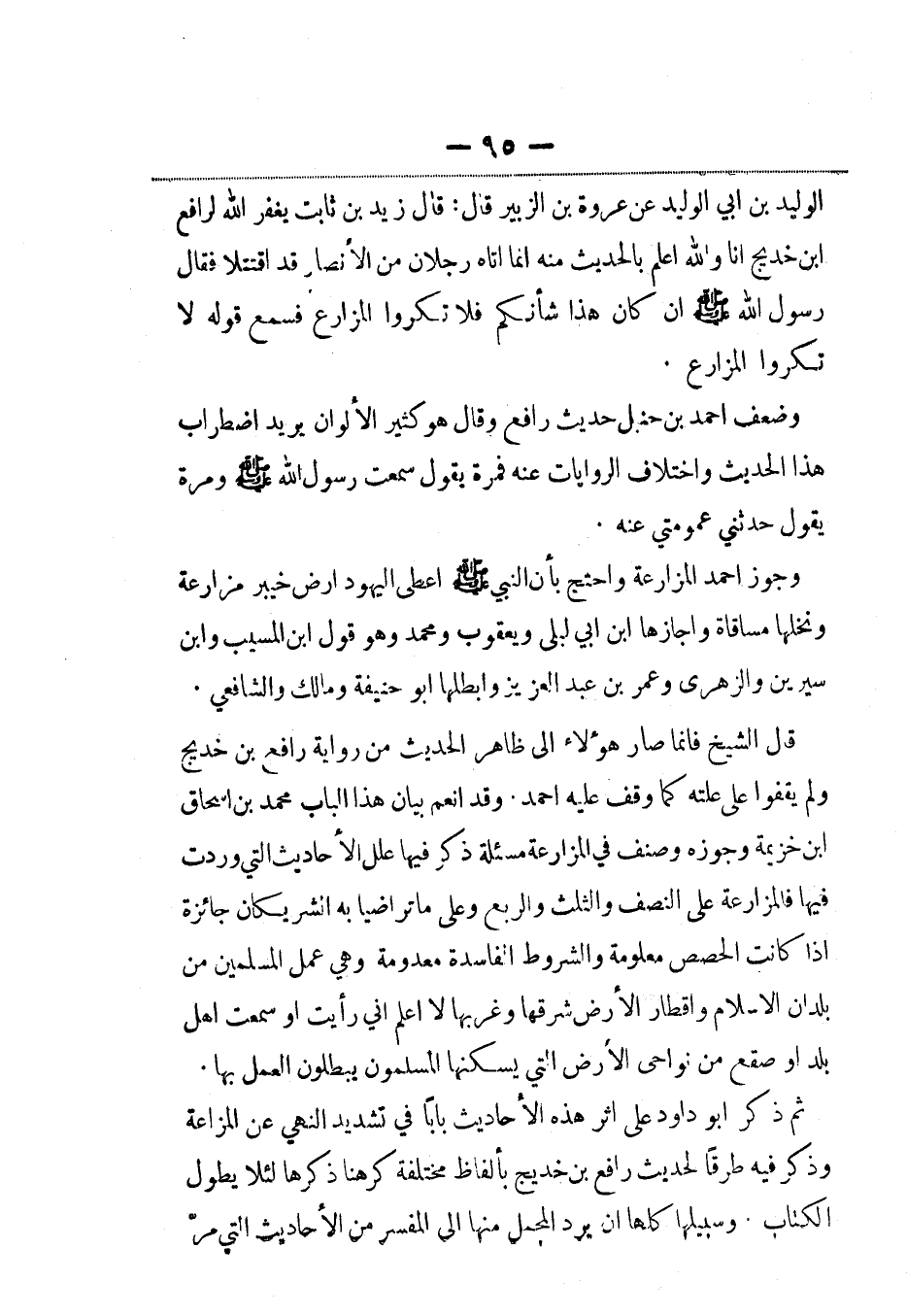 قال الشيخ فإنما صار هؤلاء إلى ظاهر الحديث من رواية رافع بن خديج ولم يقفوا على علته كما وقف عليه أحمد: وقد أنعم بيان هذا الباب محمد بن إسحاق بن خزيمة وجوزه وصنف في المزارعة مسألة ذكر فيها علل الأحاديث التي وردت فيها فالمزارعة على النصف والثلث والربع وعلى ما تراضى به الشريكان جائزة إذا كانت الحصص معلومة والشروط الفاسدة معدومة وهي عمل المسلمين من بلدان الإسلام وأقطار الأرض شرقها وغربها لا أعلم أني رأيت أو سمعت أهل بلد أو صقع من نواحي الأرض التي يسكنها المسلمون يبطلون العمل بها.