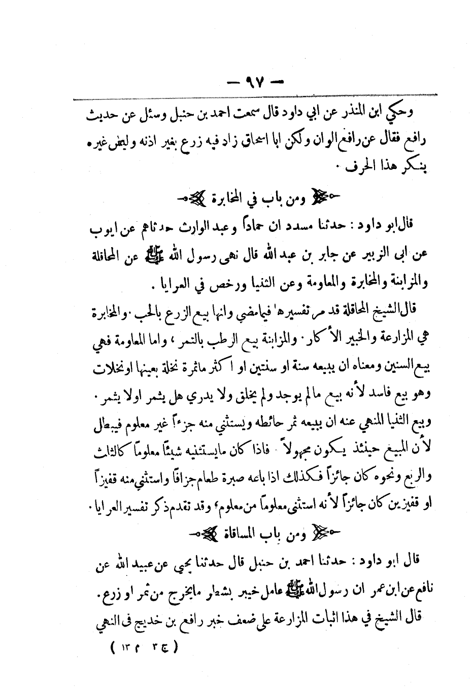 قال أبو داود: حدثنا مسدد أن حماداً وعبد الوارث حدثاهم عن أيوب، عَن أبي الزبير عن جابر بن عبد الله قال نهى رسول الله صلى الله عليه وسلم عن المحاقلة والمزابنة والمخابرة والمعاومة وعن الثنيا ورخص في العرايا.