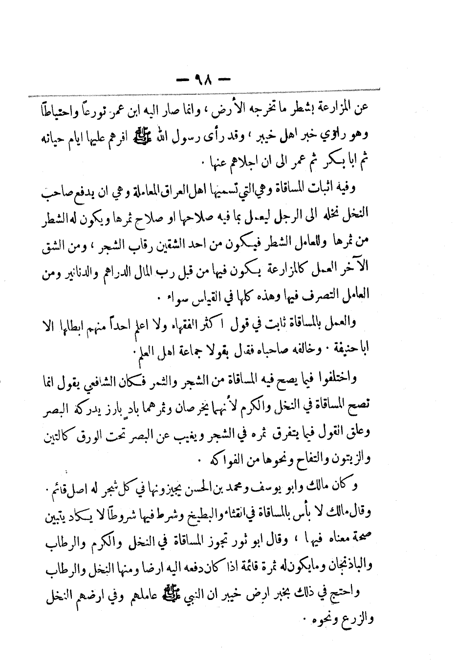 والعمل بالمساقاة ثابت في قول أكثر الفقهاء ولا أعلم أحداً منهم أبطلها إلاّ أبا حننفة. وخالفه صاحباه فقالا بقول جماعة أهل العلم.